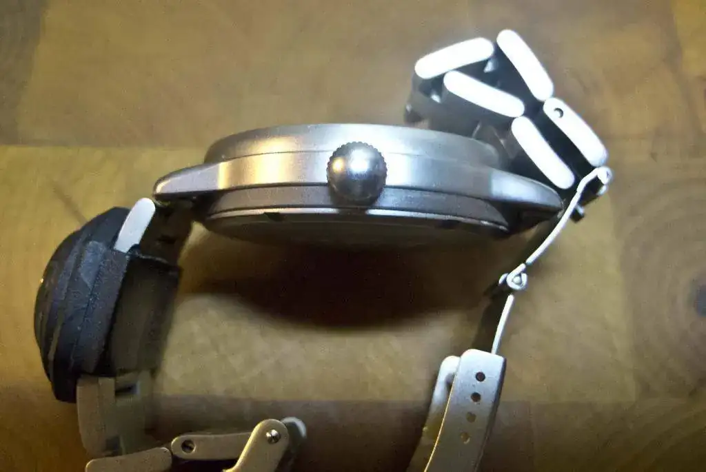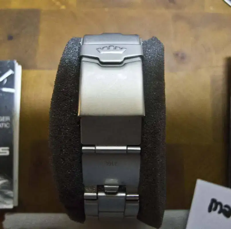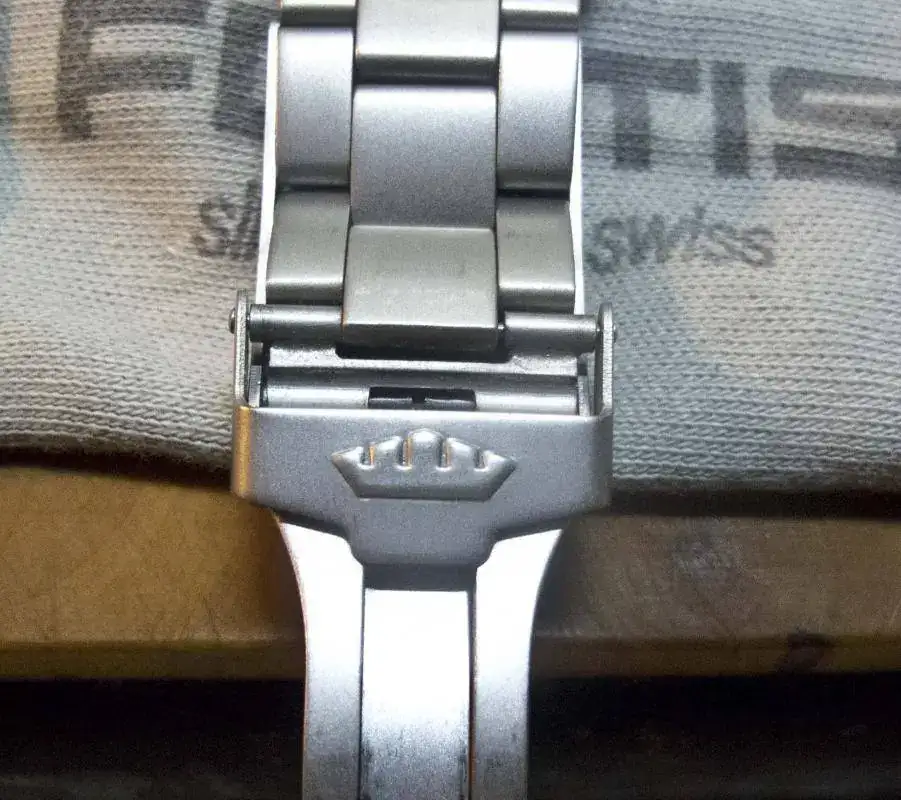 No tiene marcas en la caja ni el bisel, solo unos brillos en el cierre del armis desplegable que se ven solo a contraluz (en las fotografías ni sale).