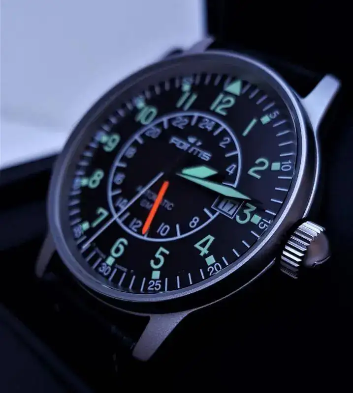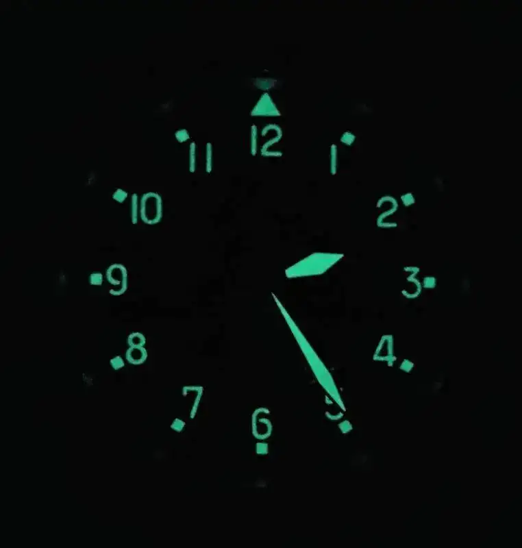 Las agujas horarias son tipo espada con Tritio, es de los últimos relojes que se construyeron usando este material y a oscuras tiene un tono verdoso impresionante.