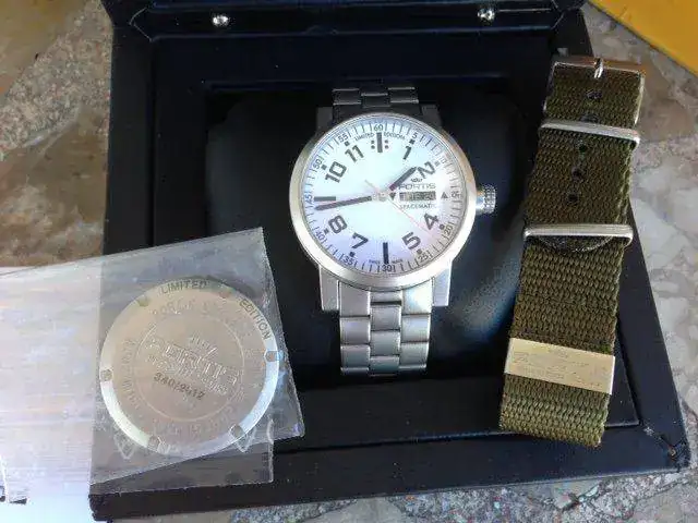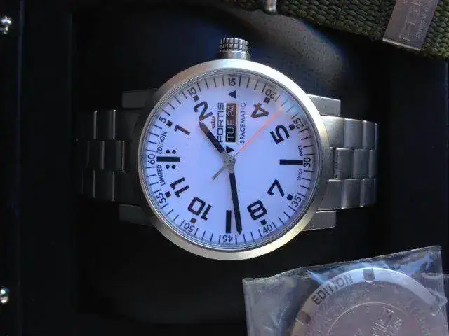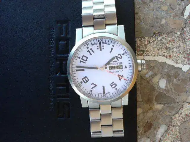 Como consecuencia de la llegasa de otra pieza mas importante, me veo en la necesidad de sacar esta pieza a la venta.En este Caso saco a la venta un Fortis Spacematic Edicion limitada. Tiene una tamaño de 40mm mas la corona, monta un movimiento Eta, Cristal de Zafiro, luminiscencia del dial en azul en la oscuridad y se le adjunta armys y una nato original. Adicionalmente al reloj se le ha montado el fondo visto. El reloj se encuentra en un estado de reestreno ya quesalvo que me falle la vista no le veo ninguna marca de uso.