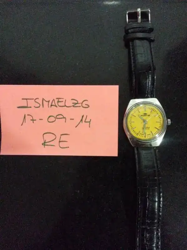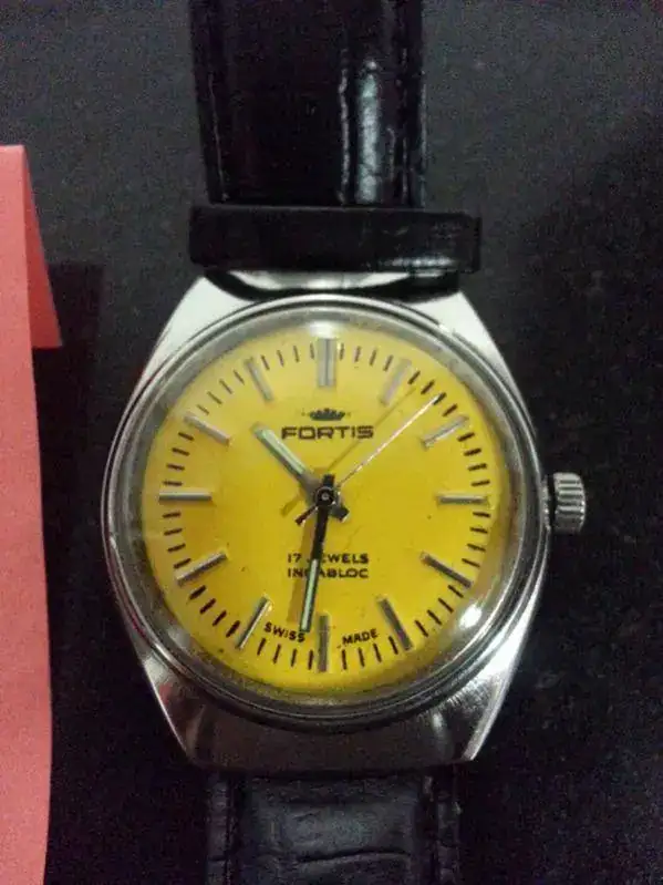 Saco este Fortis vintage con la esfera repintada en amarillo y comprado a un excelente compañero del foro en el mes de Julio. El estado de marcha y estetico es muy bueno, pero no me veo con un vintage y para tenerlo guardado, prefiero venderlo.