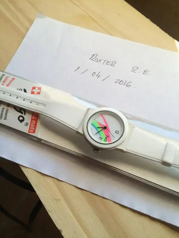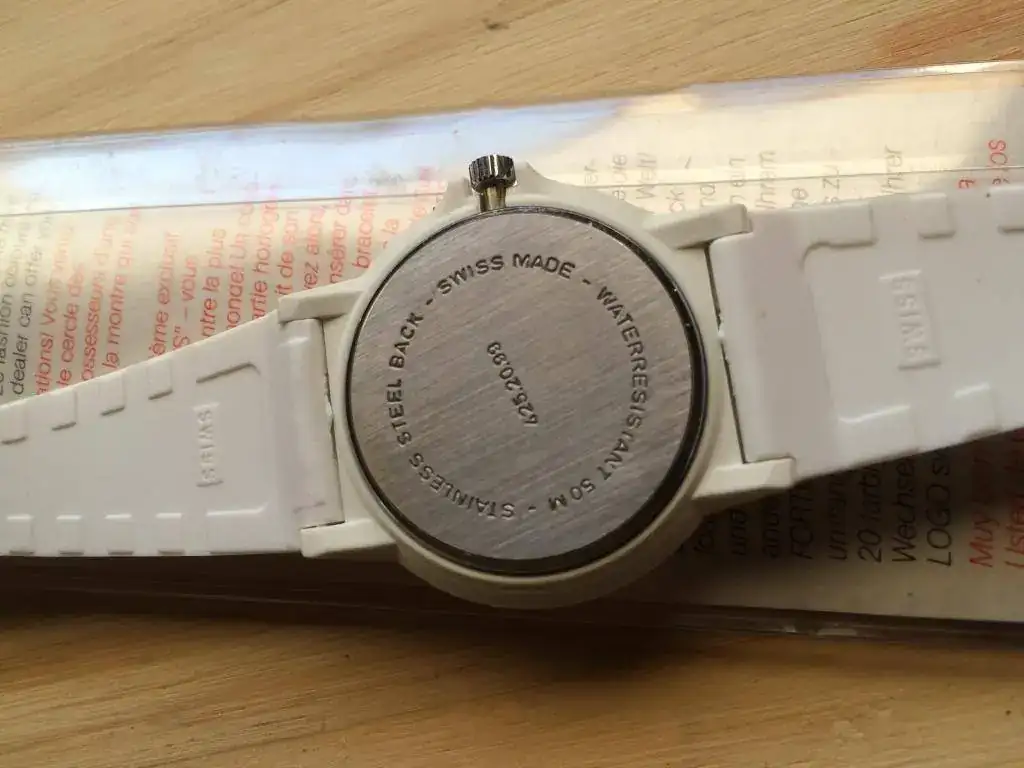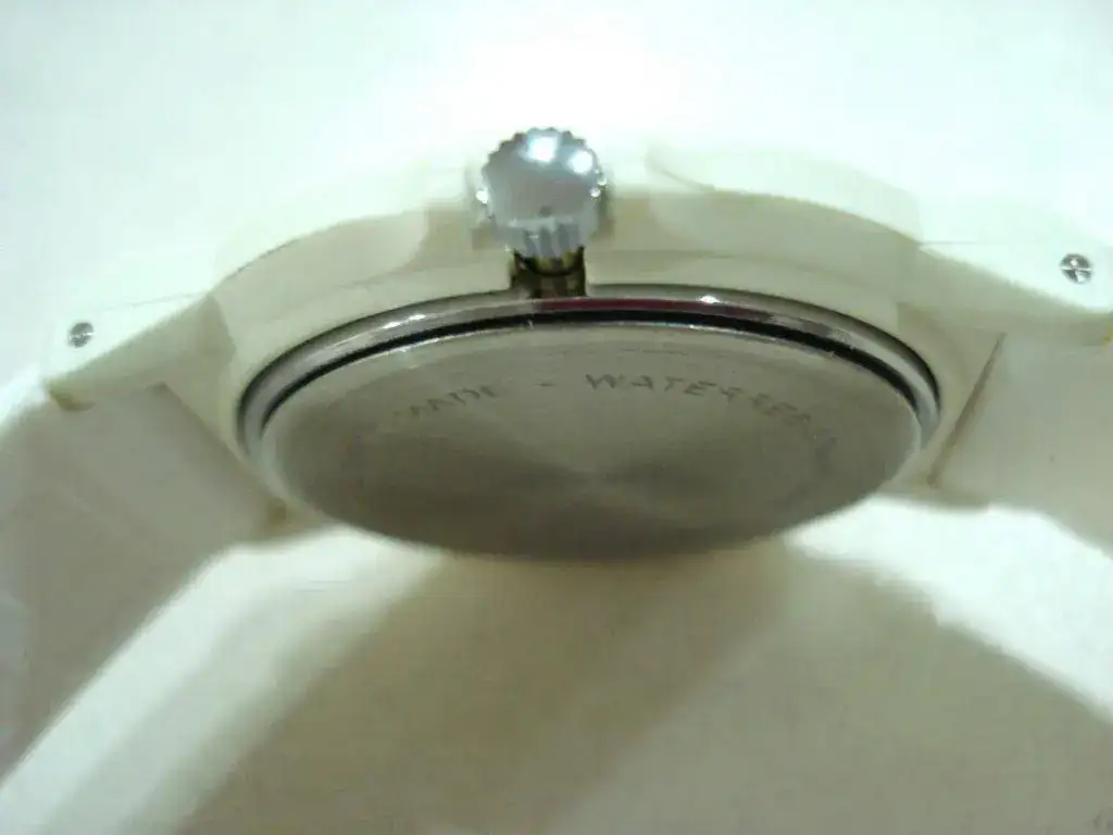 La caja es de plástico duro y el interior de acero. Mide 35mm sin corona. W/R 50mts.