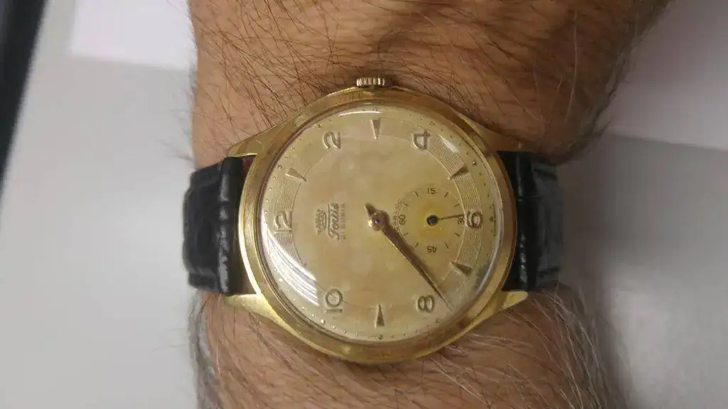 Hoy saco a la venta este bonito fortis vintage en estado de revista. Lo tengo varios años y lo habré usado unas pocas veces, y hace tiempo que no lo había sacado. Lo he probado y su marcha es correcta. El dorado de la caja está en buen estado, con alguna ralla de su uso. La correa está también en buen estado. La esfera está bastante bien, con algún desgaste a las 7. Su tamaño es generoso: 39 mm s/c y 40 mm. c/c.