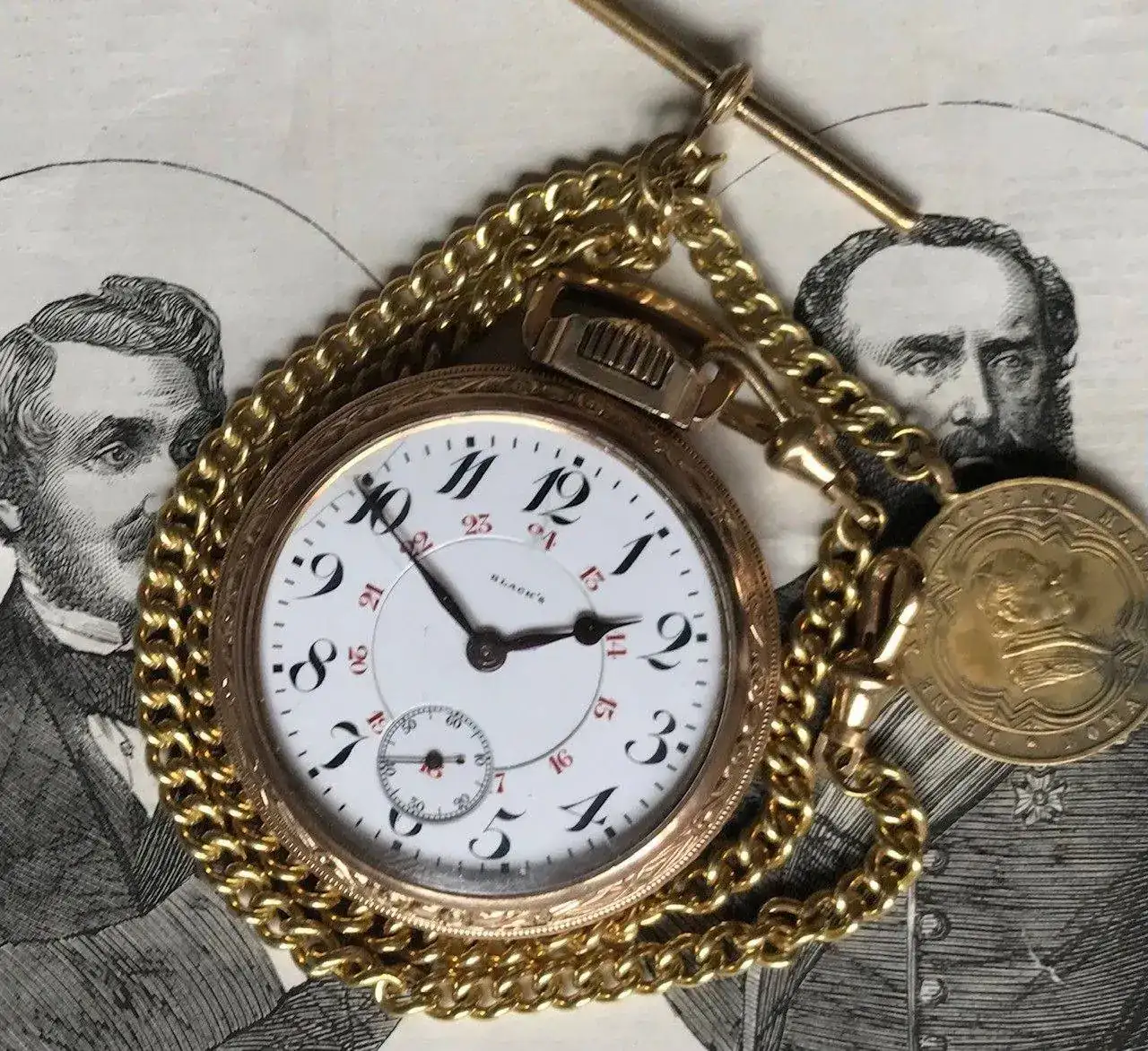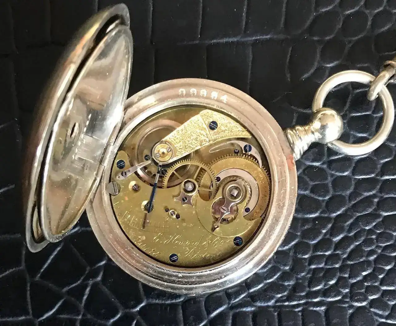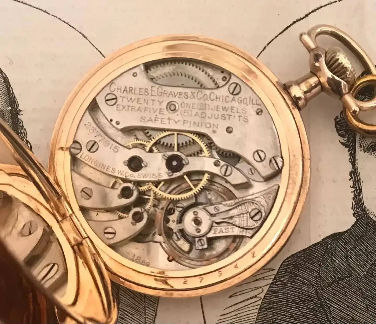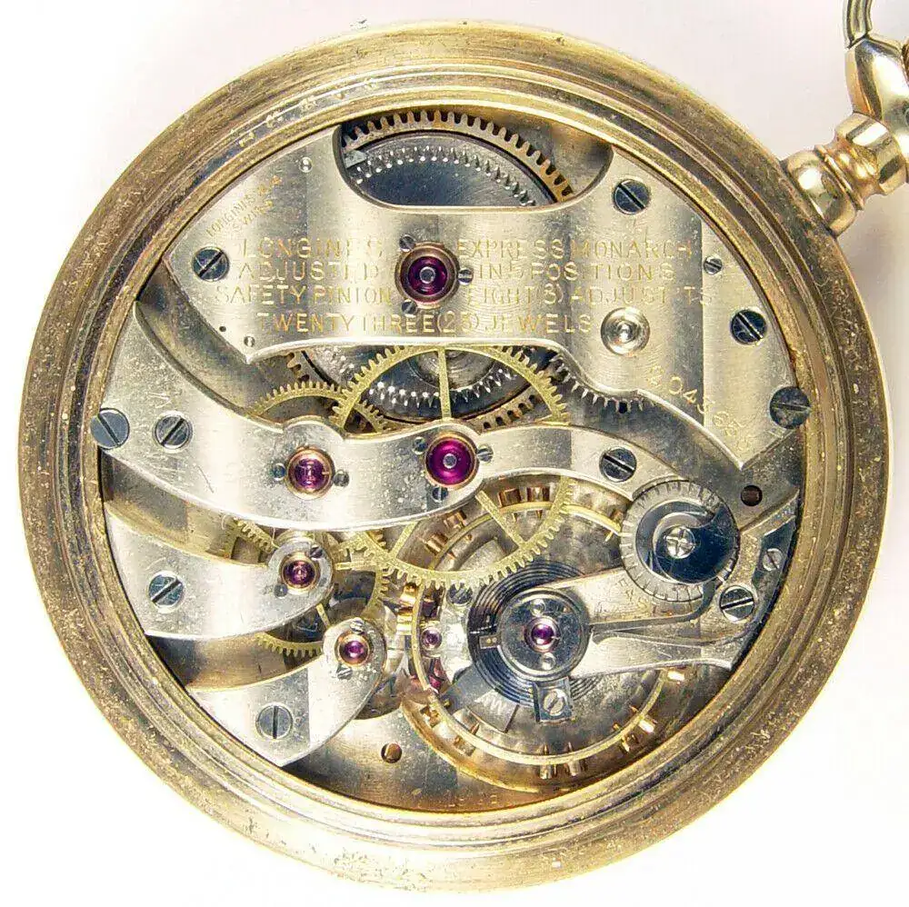 Lleva el calibre 19.95, en el movimiento podemos leer “D.E. BlACK & CO LIMITED CALGARY LONGINES EXPRESS LEADER AJUSTED 5 POSITION 19 JEWELS” La marca Express Leader era el nombre que utilizaba Longines para sus movimientos de 17 y 19 Joyas para los ferrocarriles de Estados Unidos y Canadá, este reloj fue para el mercado Canadiense con su 19 joyas lleva joyas en el eje de la rueda del trinquete, cambio horario por palanca, microregulador tipo Wilmot