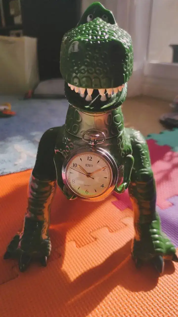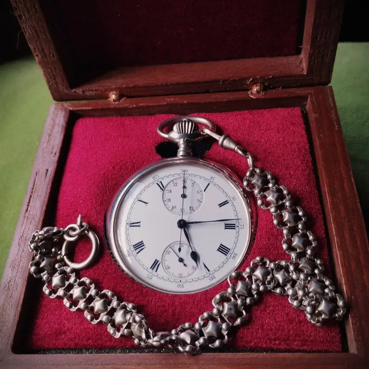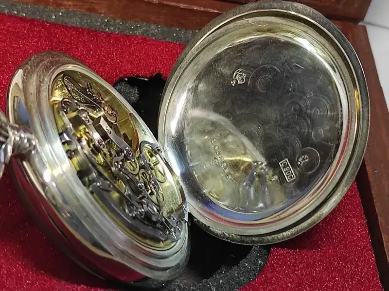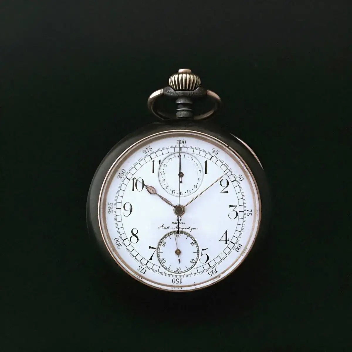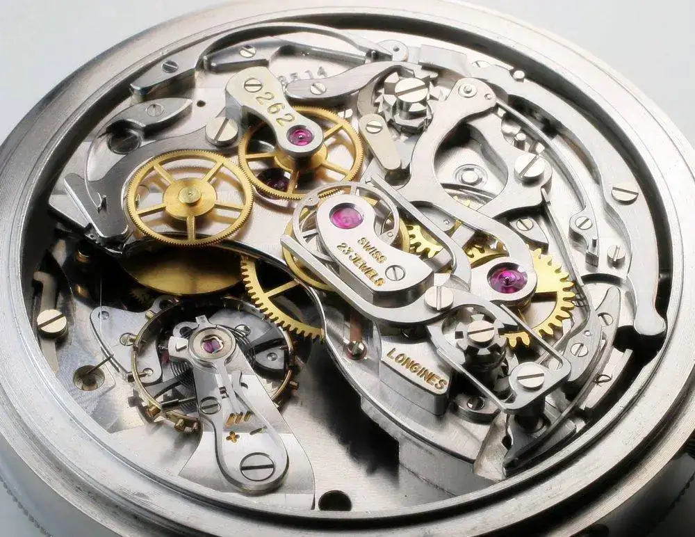 Cronometro Longines del 1966, dotato di calibro 262, da 36.000 alternanze/ora, misura a 1/10 di secondo, sistema di arresto del bilanciere, ruota a colonne. La lancetta dei secondi del cronometro completa una rotazione in 60 secondi (minuti del cronometro in 30 unità).