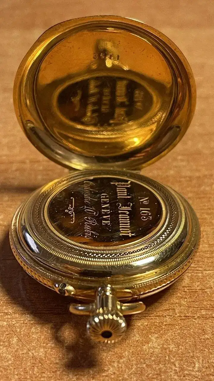 Ni se te ocurra tirar hacia afuera de la corona. En la parte superior del colgante, donde está la anilla, hay un pequeño botón (uñero) que debes apretar para ponerlo en hora con la corona. Dar cuerda si que deberías poder, sin apretarlo, pero quizás sea necesario hacerle un servicio. prueba primero de mover las agujas. Por cierto, bonito reloj!Muy buenas soy nuevo en el foro y os agradezco mucho el haberme acogido tan amablemente. Entre algunos objetos heredados he encontrado este reloj de bolsillo de oro marca Paul Jeannot. Está grabado con el número 163 y pone Cylindre 10 Rubis. Por lo que he leído en Google y Ebay son piezas con un cierto valor. He intentado mover la corona para darle cuerda pero no consigo que gire o que suba para el típico cambio de hora. La pregunta es si consideráis que merece la pena llevarlo a ver si tiene arreglo y si me podéis recomendar un relojero de confianza en Valencia capital. Tampoco puedo abrir una tapa interior que creo que lleva en uno de los lados por la que se ve la maquinaria, por lo demás está en perfecto estado y es muy bonito sobre todo la esfera. Mil gracias por vuestra ayuda.