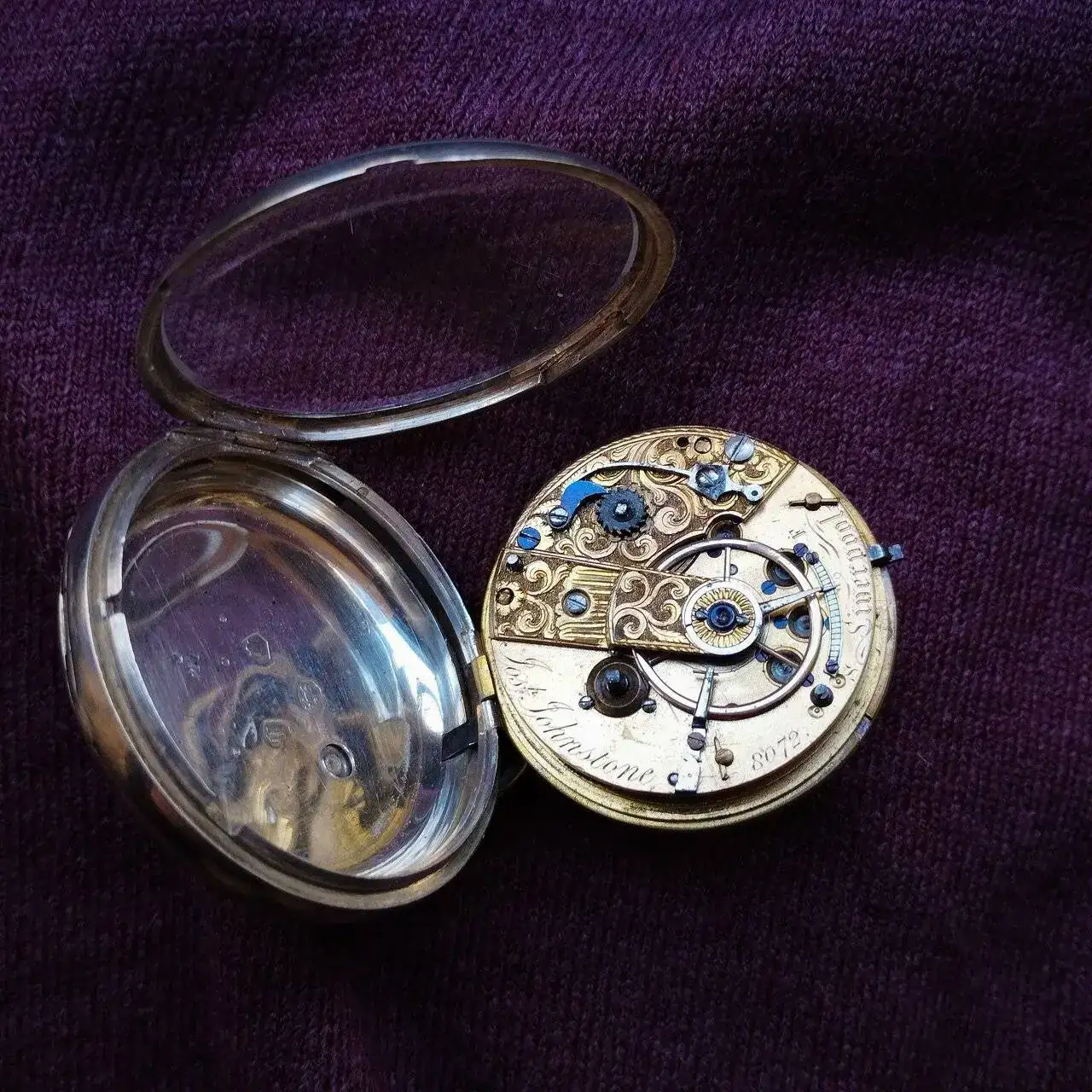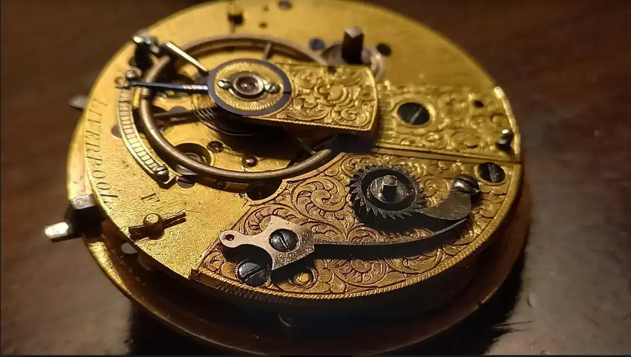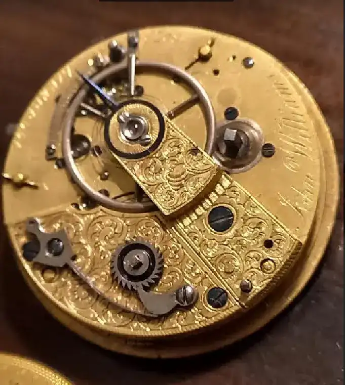 Efectivamente, se trata de un reloj del tipo "Liverpool Runner" de mediados del XIX. Los llamados “Liverpool Runners” (definición moderna que se ha adoptado para nombrar a este tipo de ébauches) son aquellos movimientos con el trinquete de ajuste de tensión del fusee expuesto en la placa superior (como podemos observar a la izquierda de la imagen superior) y con el tren invertido (posiblemente para reducir la fricción). En este caso, la leva del escape se sitúa a la izquierda de la rueda de escape y no a la derecha como es habitual. Una de las posibles ventajas de esta configuración especial en un mecanismo (aparte de reducir considerablemente la tensión que efectúa el muelle real sobre la rueda y el piñón de transmisión) es que el conjunto del escape queda más protegido ante una posible rotura de la cadena del fusee. Este tipo de relojes, junto con los "Liverpool Windows" se hicieron muy populares y se exportaron mayoritariamente al continente norteamericano. En esta imagen puedes ver la configuración de tu reloj.