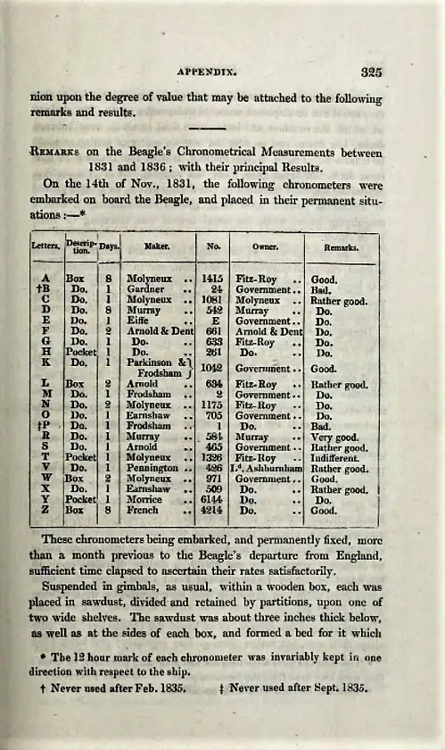 El 27 de diciembre de 1831, el HMS Beagle zarpó del puerto de Plymouth con el objetivo de realizar un levantamiento hidrográfico de las costas más meridionales de América del Sur. Para realizar este levantamiento, el capitán FitzRoy debía realizar anotaciones precisas referentes a determinar la longitud en diferentes zonas previstas de su ruta. Estas anotaciones que establecían con exactitud nuevas longitudes entre meridianos, estaban destinadas a la realización de nuevas cartografías que facilitasen la navegación comercial y marítima del Imperio con los puertos del nuevo continente.