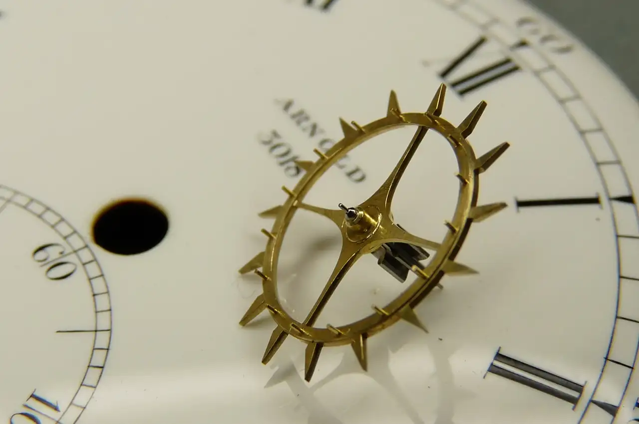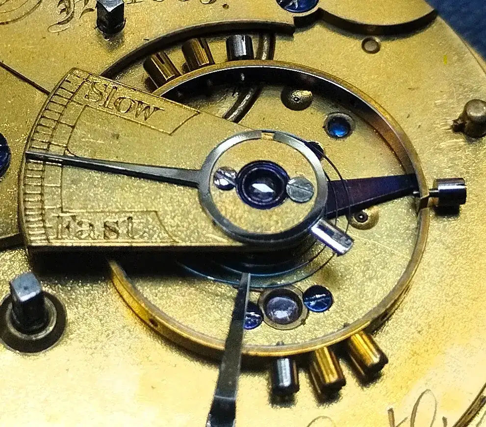 Pero si algo hay que destacar de este movimiento, es la incorporación de un volante contrapesado (con los tornillos de ajuste realizados en platino) y ajustado a temperatura como indica su corte. Este tipo de volantes, que por aquella época solo se equipaban en los cronómetros de bolsillo, indican el aprecio que tenían los fabricantes punteros hacia el escape del tipo dúplex, como buenos cronometradores, si bien es cierto que por su naturaleza eran bastante delicados.