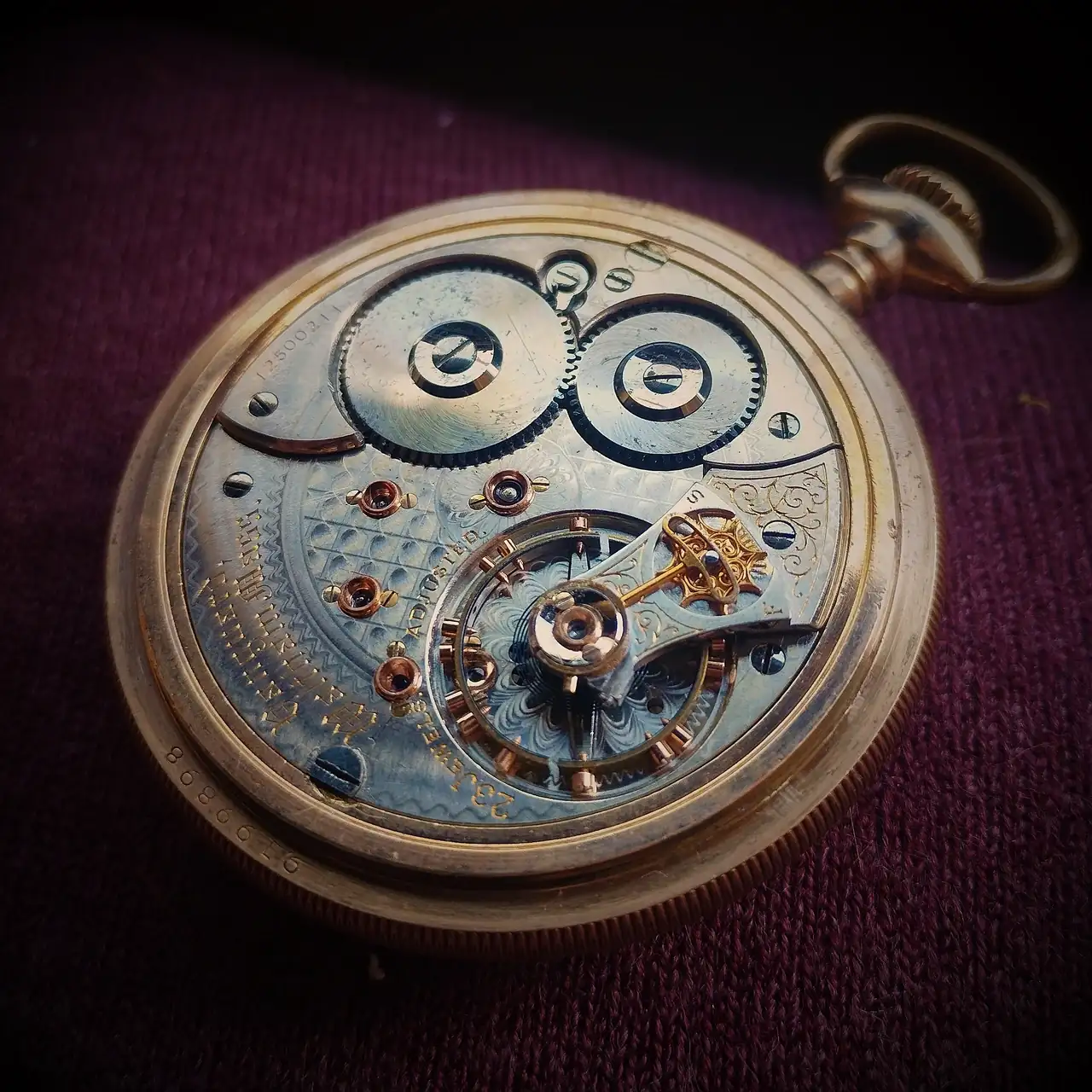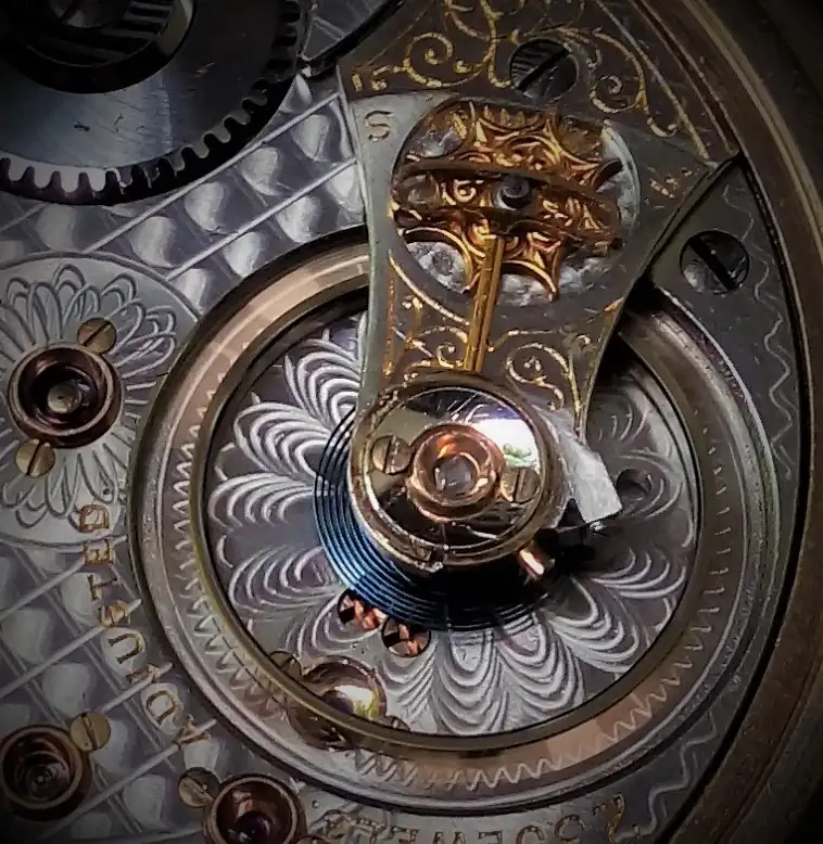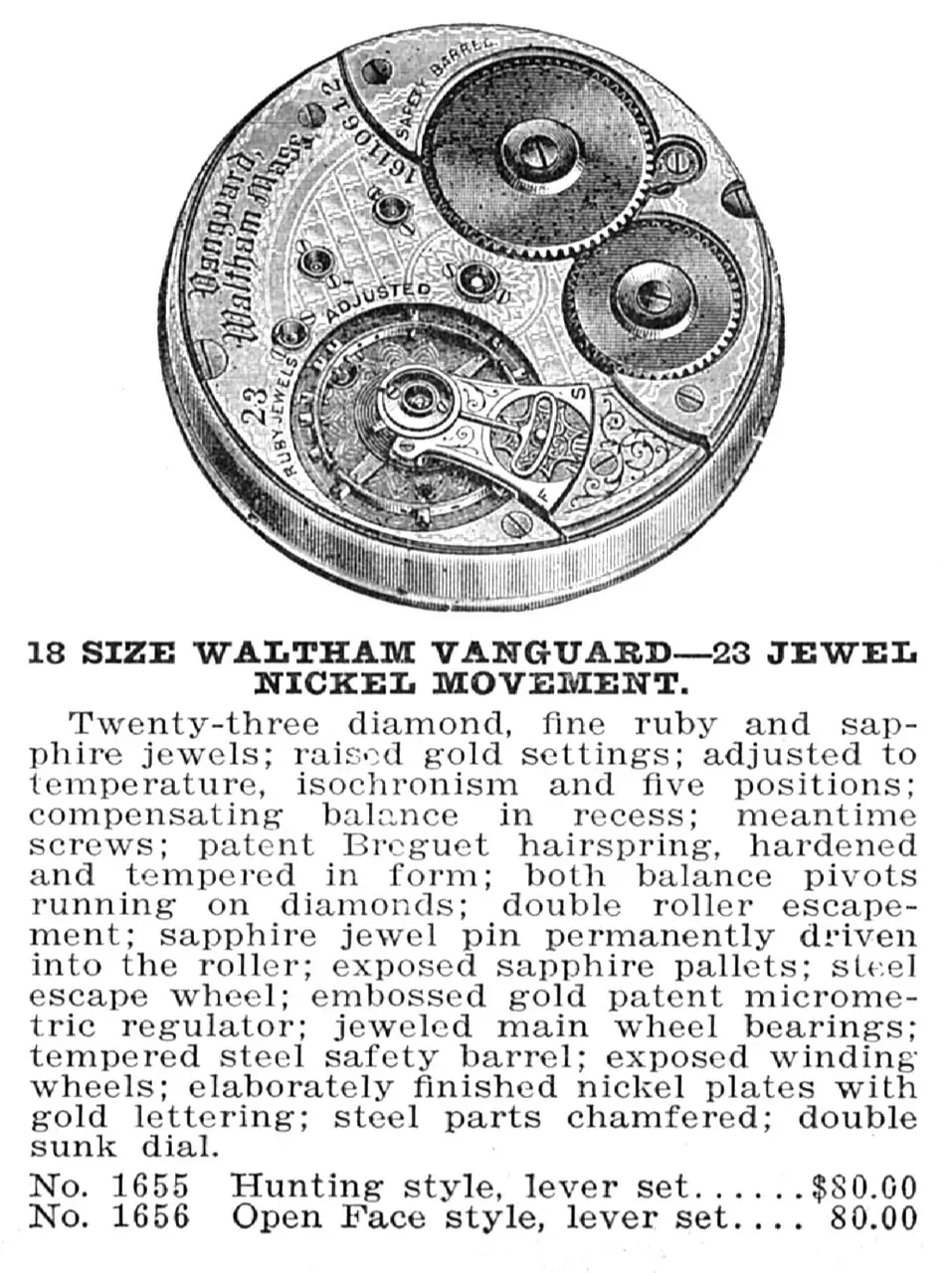 Precioso movimiento y damasquinado, no sabia que el eje estaba montado en diamante, en la pagina Pocket watch database no lo especifica, como anectoda vendi un 21 J para hacerme con un 23 J, me encantaba el regulador "Iglesia 1892" pero en aquel momento no habia, pero salio en Inglaterra un 23J en caja de plata con el regulador "Ohlson 1908" y lo compre, un año mas tarde salio un 23 J con el regulador "Iglesia 1892" no acostumbro a tener 2 relojes iguales, pase de el, pero el ultimo dia vi que casi nadie pujaba por el reloj, no entendi el porque, lei la descripcion y el vendedor ponia que no se podia cambiar la hora, pense es Amercano entiendo que sabra que se cambia por la palanca, me ariegue y lo compre a precio de deribo, cuando llego a casa tire de la palanca y el reloj funcionba perfectamente......Waltham Vanguard 23j modelo 1892, circa 1903