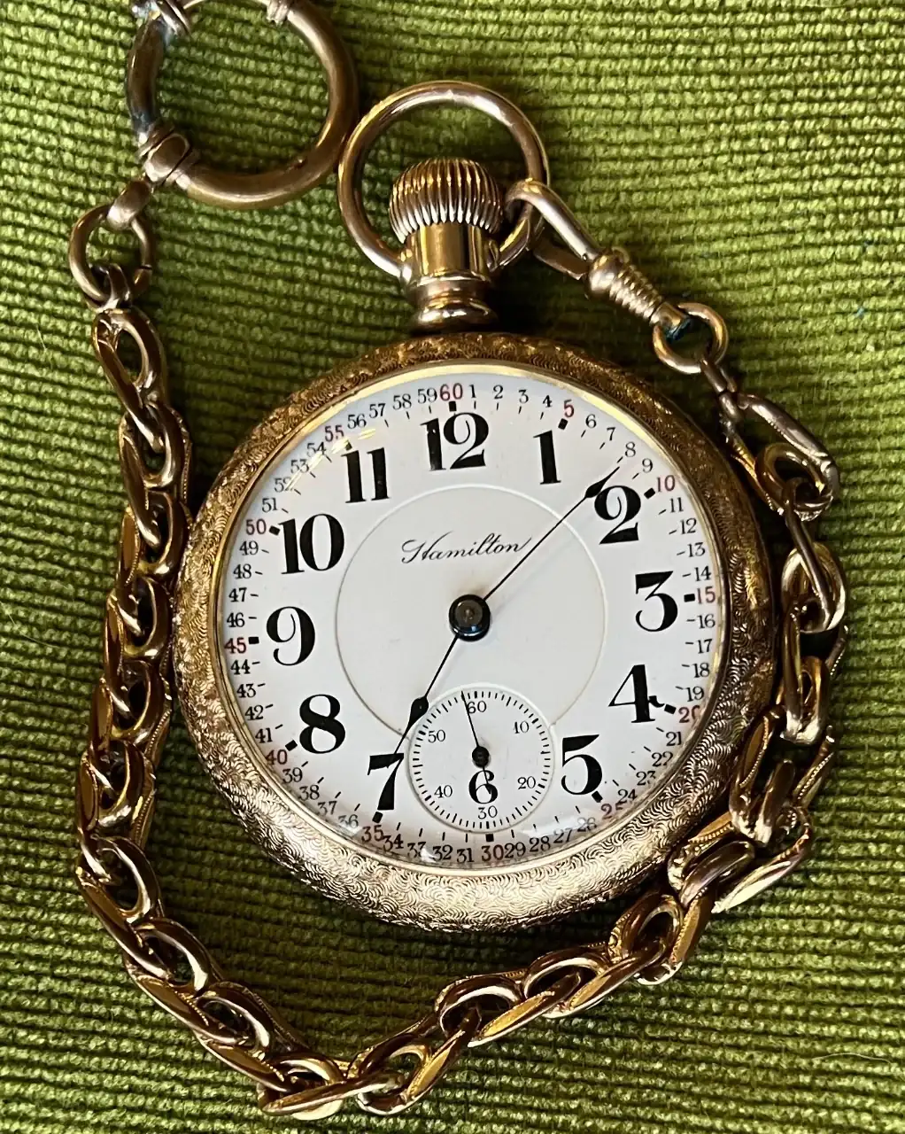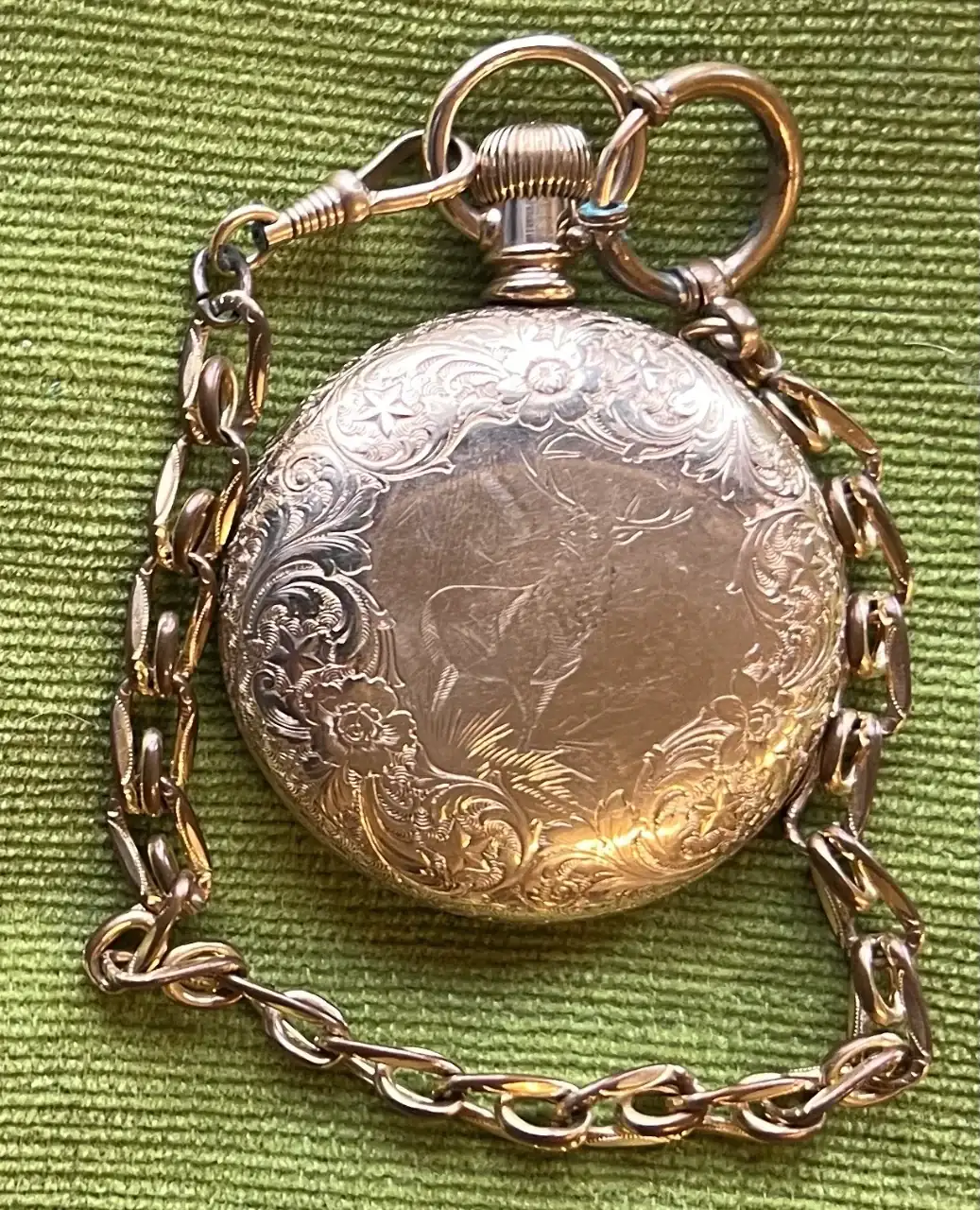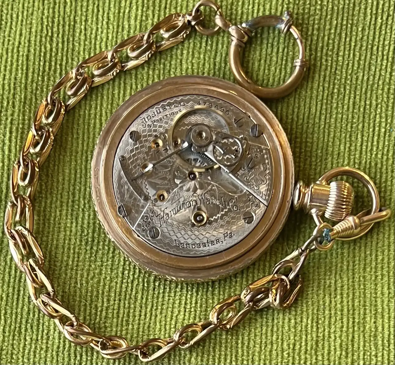 Precioso movimiento y damasquinado, no sabia que el eje estaba montado en diamante, en la pagina Pocket watch database no lo especifica, como anectoda vendi un 21 J para hacerme con un 23 J, me encantaba el regulador "Iglesia 1892" pero en aquel momento no habia, pero salio en Inglaterra un 23J en caja de plata con el regulador "Ohlson 1908" y lo compre, un año mas tarde salio un 23 J con el regulador "Iglesia 1892" no acostumbro a tener 2 relojes iguales, pase de el, pero el ultimo dia vi que casi nadie pujaba por el reloj, no entendi el porque, lei la descripcion y el vendedor ponia que no se podia cambiar la hora, pense es Amercano entiendo que sabra que se cambia por la palanca, me ariegue y lo compre a precio de deribo, cuando llego a casa tire de la palanca y el reloj funcionba perfectamente......Waltham Vanguard 23j modelo 1892, circa 1903