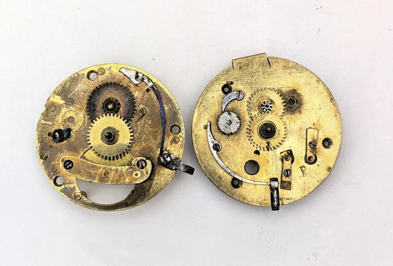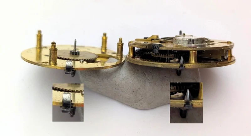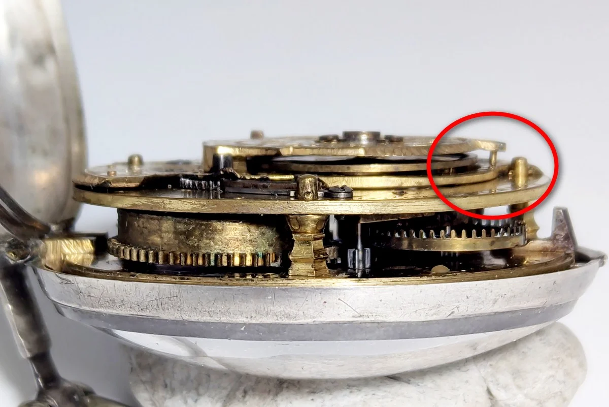 En esta imagen se puede apreciar que equipa el típico escape de palanca inglés (con el áncora enjoyada) y también podemos ver una especie de gancho, que se acciona con una palanca, que servía para bloquear el reloj, a voluntad del propietario. Algunos avispados vendedores definen a este tipo de relojes con parada, como "Doctor's Watch". Nada más alejado de la realidad! este tipo de parada tenía el prosaico uso para poder sincronizarlo con el reloj de la torre del ayuntamiento u otro reloj, para llevar la hora correcta.