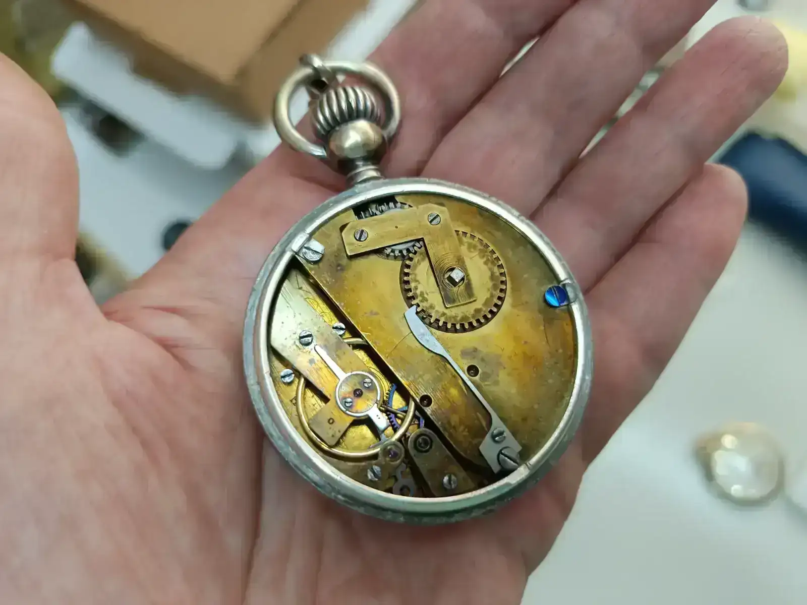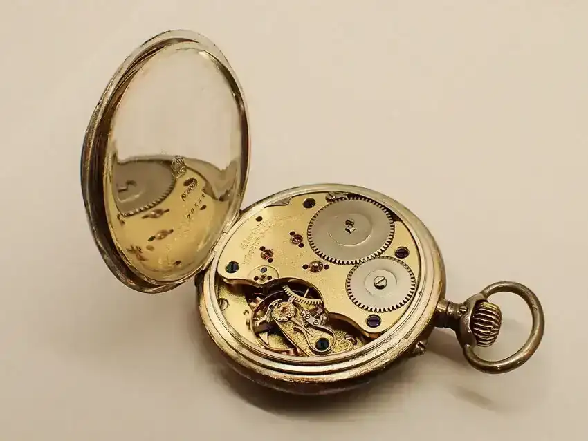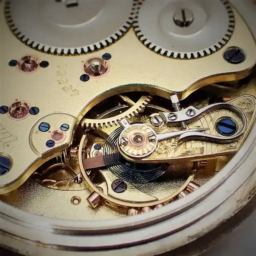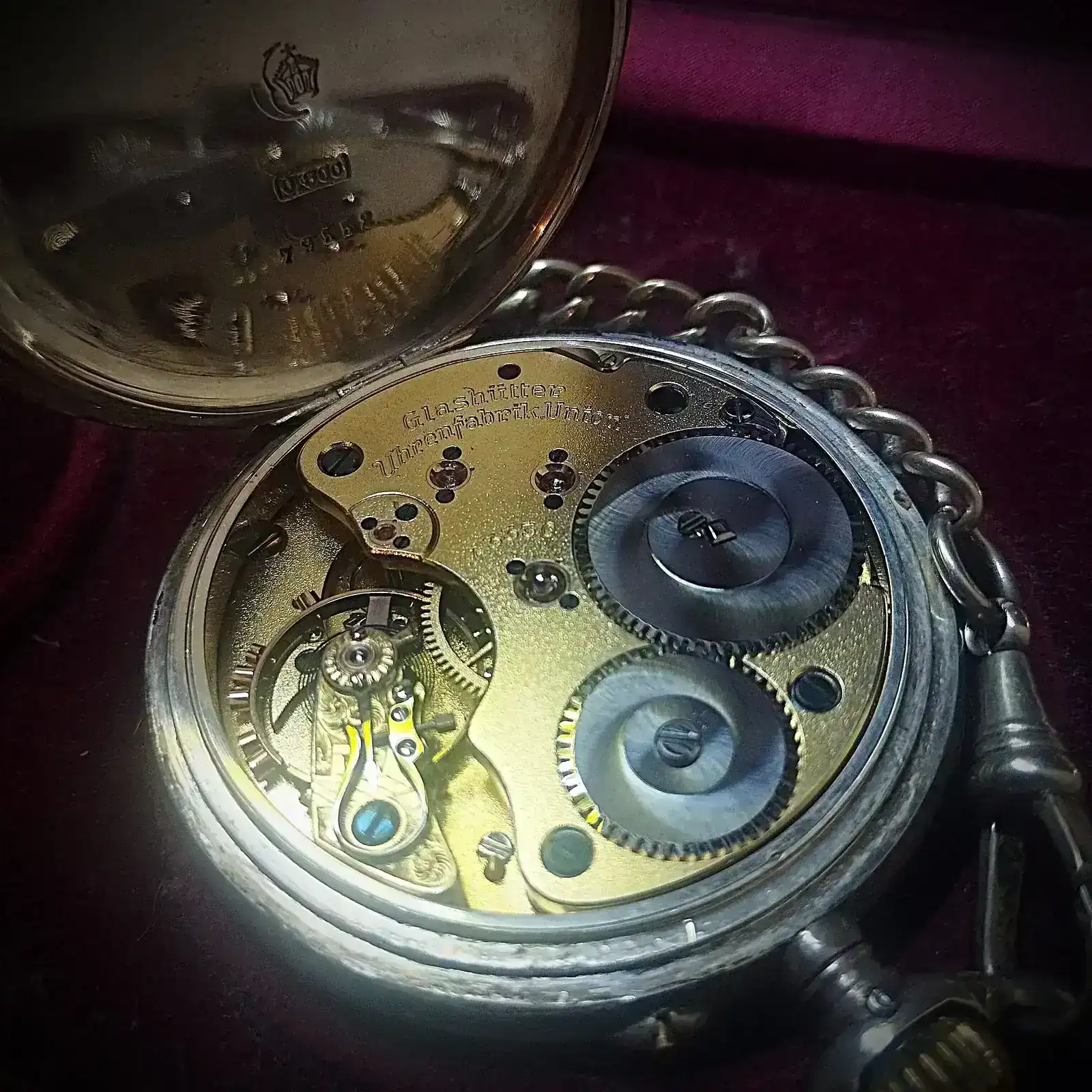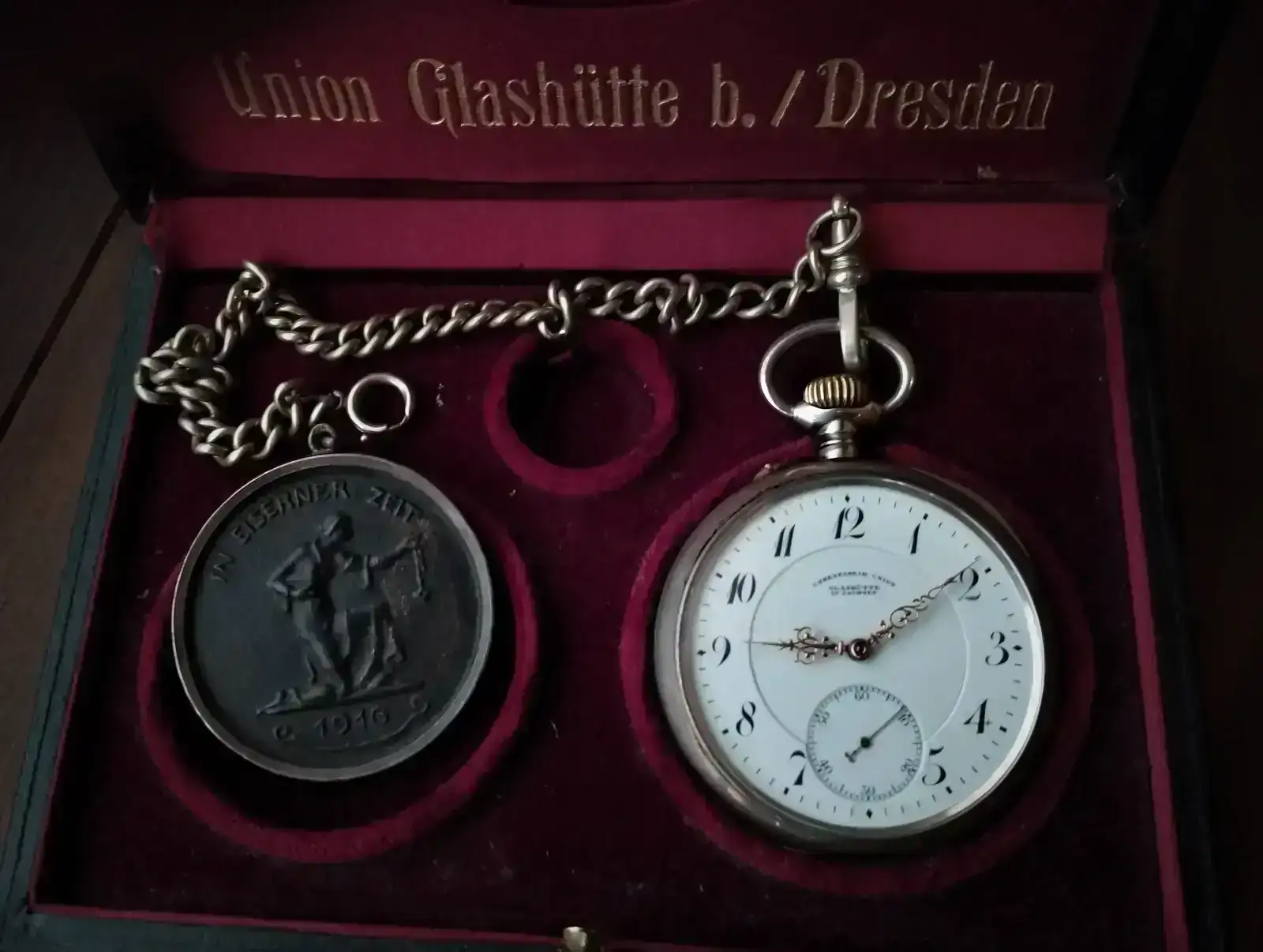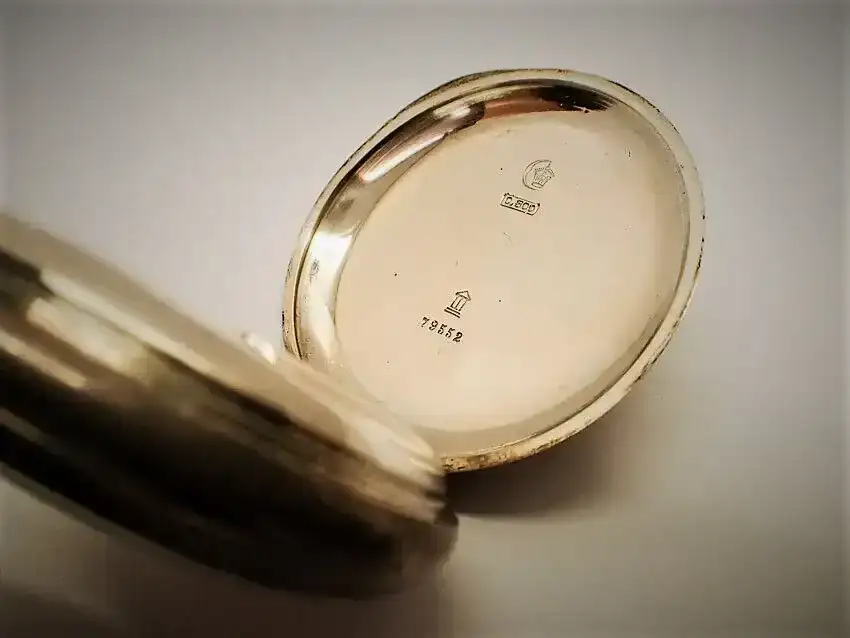 “Dado que la versión 1A del reloj se fabricó en 1895/96, es muy probable que tuviera una caja de oro. Dado que la caja de plata en la que está ahora el movimiento lleva el número 79552 y data de 1917/1918, o incluso 1919, parece razonable suponer que el propietario de la época había donado el oro de la caja como préstamo de guerra en la campaña “Gold gab ich für Eisen” (Di oro por hierro) y había hecho encajar el movimiento en una caja de plata por la fábrica de relojes Union. Al menos yo me he encontrado con relojes así de esta época. Esto haría que el reloj tuviera interés histórico y le daría una historia interesante para las generaciones posteriores.”