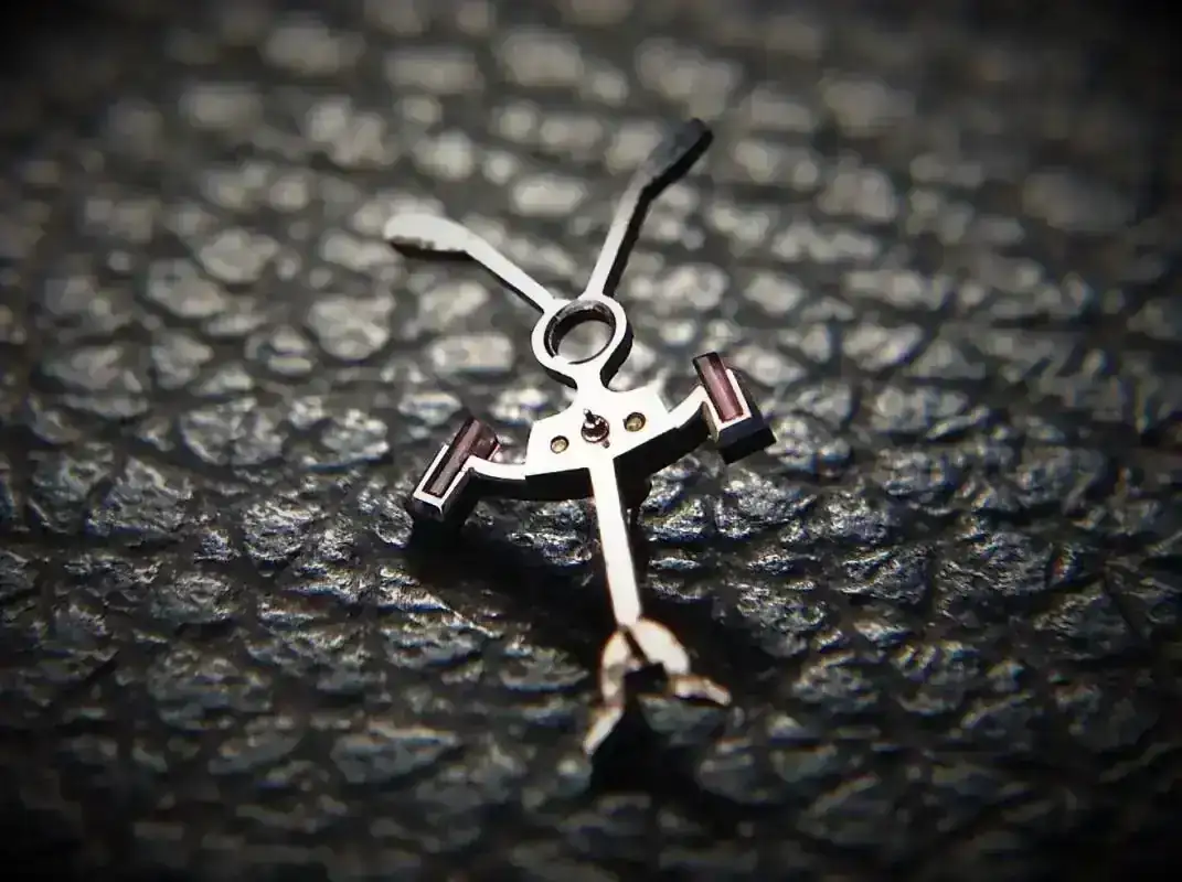 Detalle de la rueda de escape, realizada en oro amartillado de 9 quilates, tan fuerte como el acero y alargaba la vida de los aceites, pues evitaba su oxidación química. Podemos ver los chatones de oro atornillados (5 en total) y los contrapesos del volante también realizados en oro. El regulador micrométrico en acero muy pulido e increíblemente trabajado.
