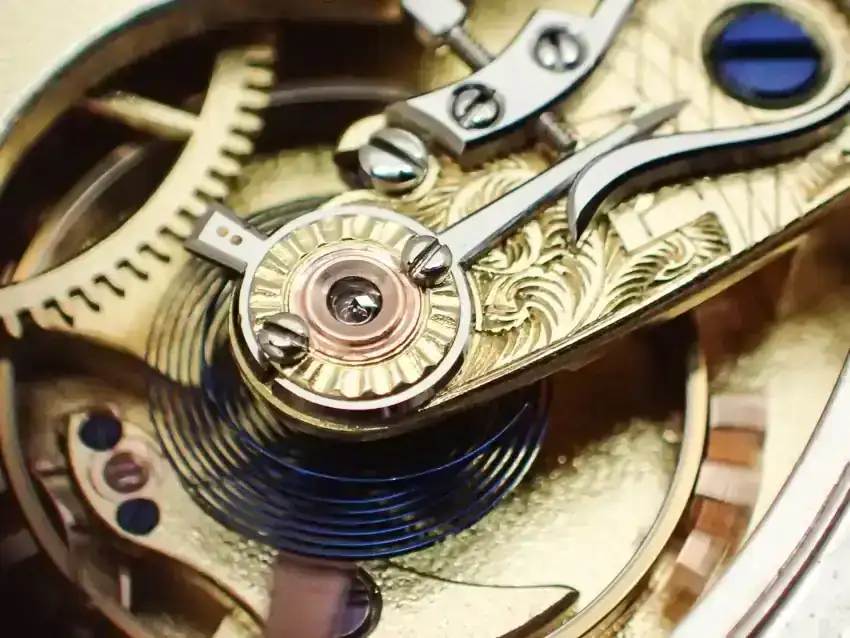 El puente del volante, bellamente labrado a mano con el eje del volante pivotando sobre un diamante. La espiral Breguet con Overcoill.