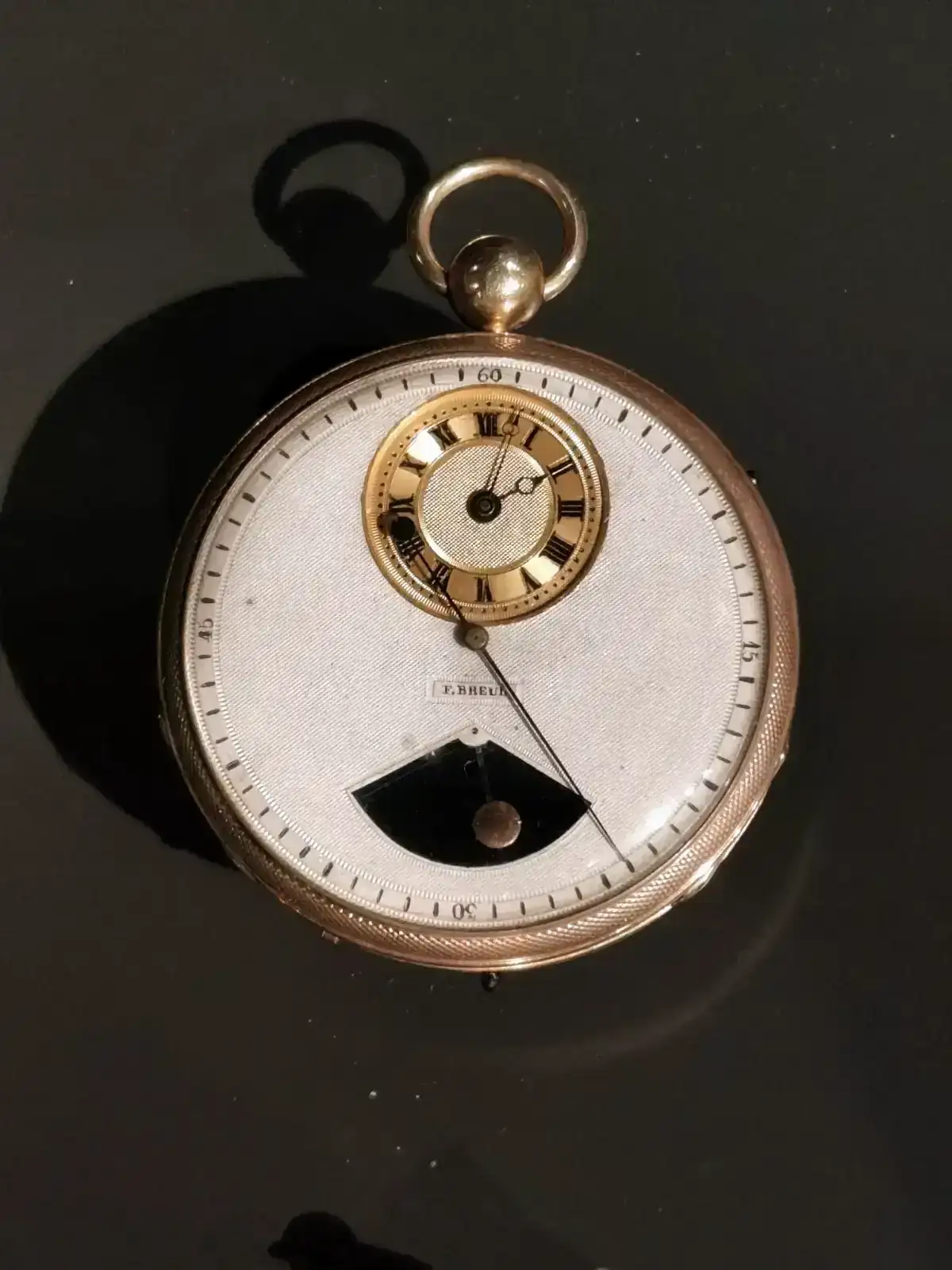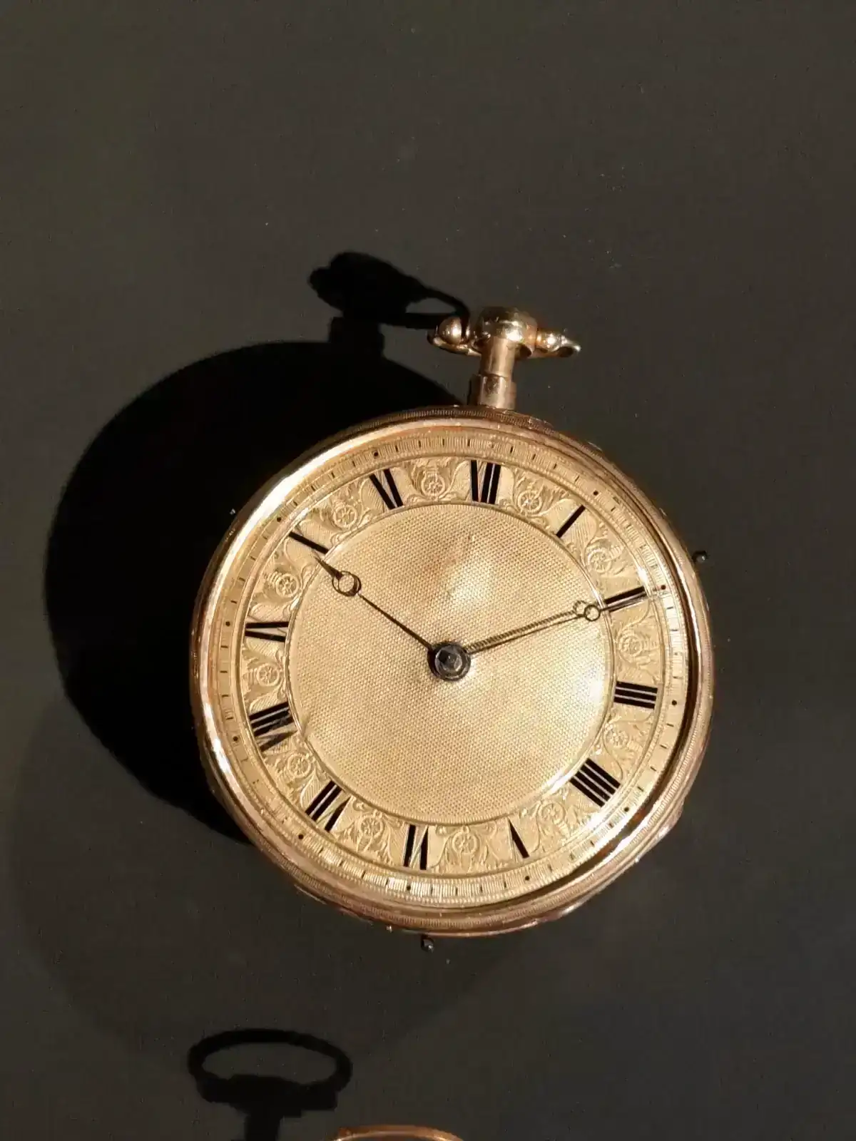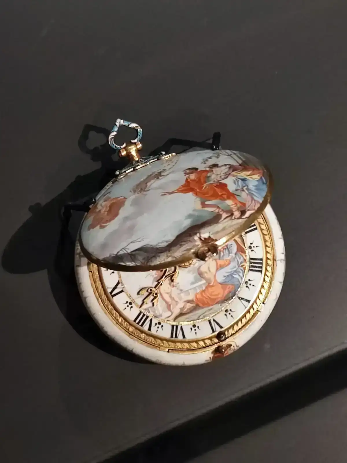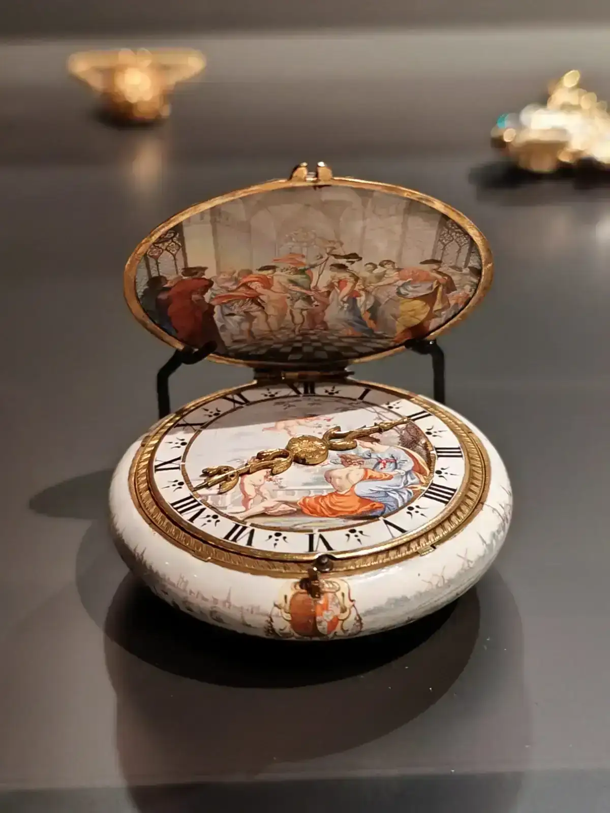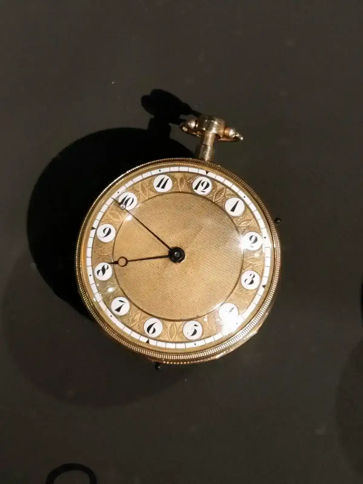 Todo en este reloj rezuma una verdadera calidad. Su dial esmaltado, es magnífico, con un brillo que mi pobre cámara del telf no puede capturar. Le acompaña un estilizado y barroco juego de agujas estilo Luis XIV en oro de 18 quilates.