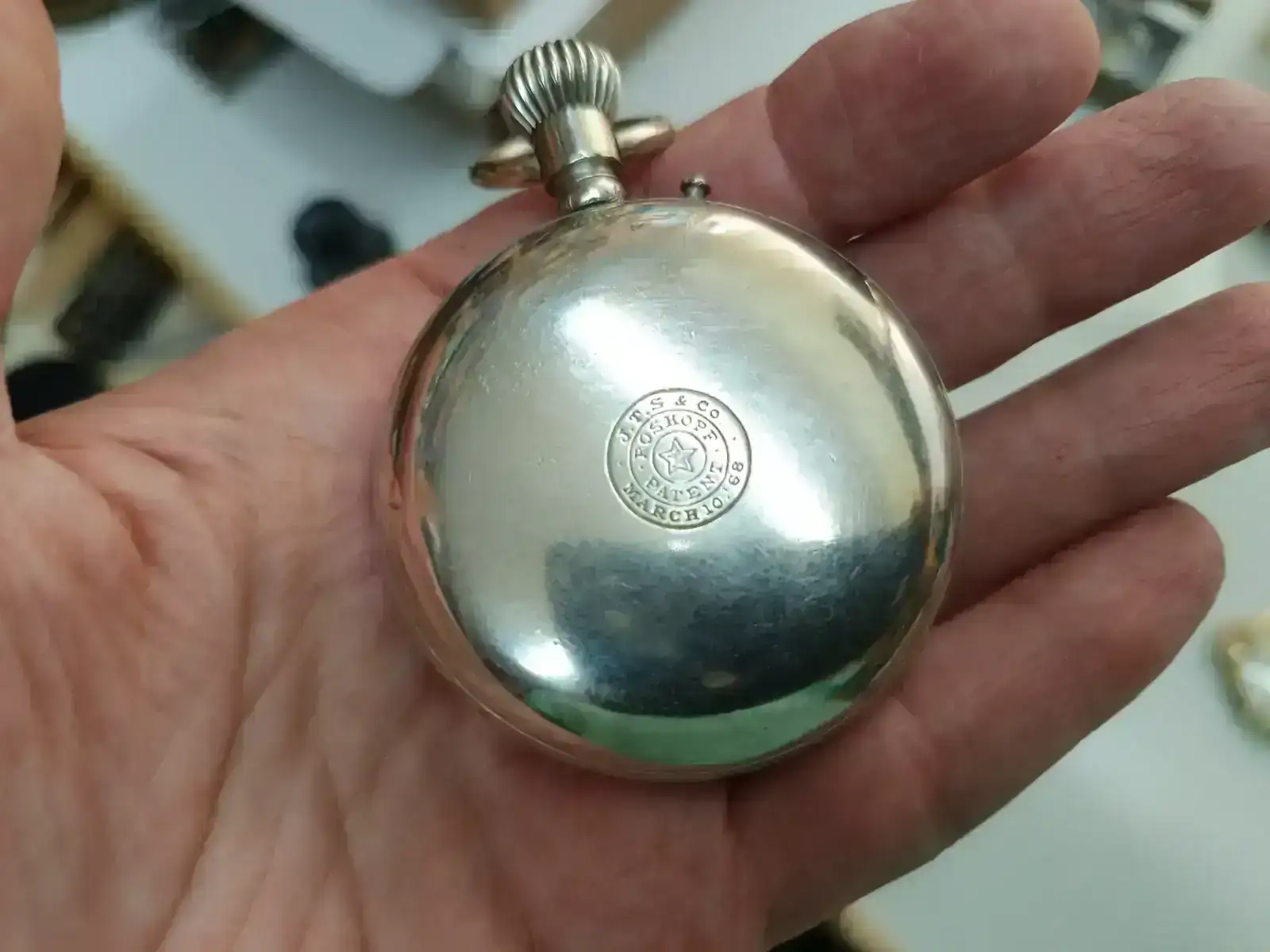 Una de las cosas que más me llamó la atención de mi reloj, es su bonita y pesada caja de plata donde se aloja. Efectivamente, no es muy habitual ver relojes de PP alojados en caja de plata. Esta lleva incrustaciones de oro en las pestañas de la tapa, las bisagras y la corona. La caja lleva impreso en las dos tapas el nº de serie del reloj y el logo del conocido fabricante americano Jeannot & Shiebler. Este fabricante, afincado en Nueva York, se especializó (circa 1882) en producir y suministrar cajas de oro a las principales joyerías del país, en las que se alojaban los mejores relojes importados de Europa. Son muy recurrentes sus ejemplos en relojes de PP que se exportaron para su venta en el nuevo continente. No es nada habitual ver cajas de Jeannot & Shiebler fabricadas en plata y menos con estos engastes de oro. Tampoco es muy habitual ver relojes de PP que no estén en cajas de oro. ¿Fue quizás un encargo especial de un cliente? No lo sabremos nunca, pero su ejecución es realmente excepcional.