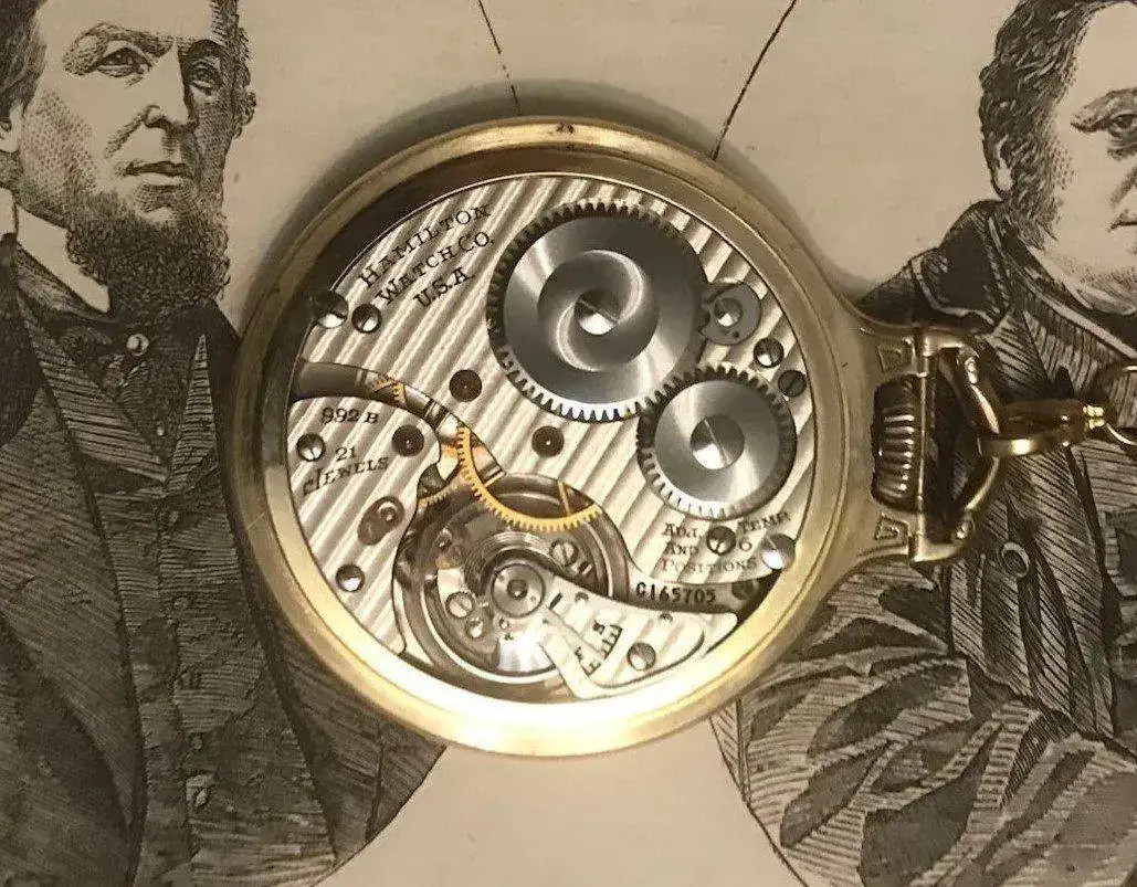 Lleva el Calibre 992B de 21 joyas, en su momento muchos dijeron que este movimiento fue uno de los mejores jamás producidos en un reloj de bolsillo, si alguna vez desarma un 992B y lo vuelve a armar, apreciará cómo es un reloj que realmente está diseñado para facilitar su servicio, todos los ejes encajan con los rubís con mucha facilidad, especialmente en comparación con otros relojes de ferrocarril estadounidenses diseñados con el mismo objetivo.