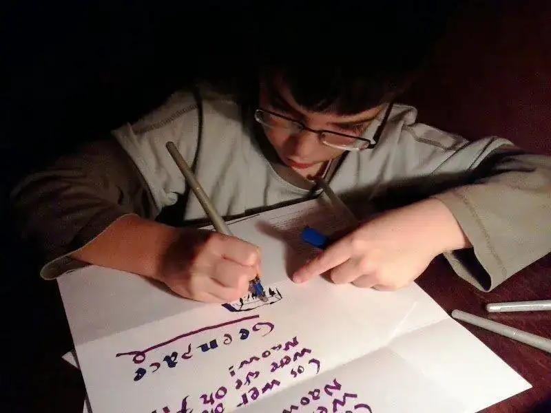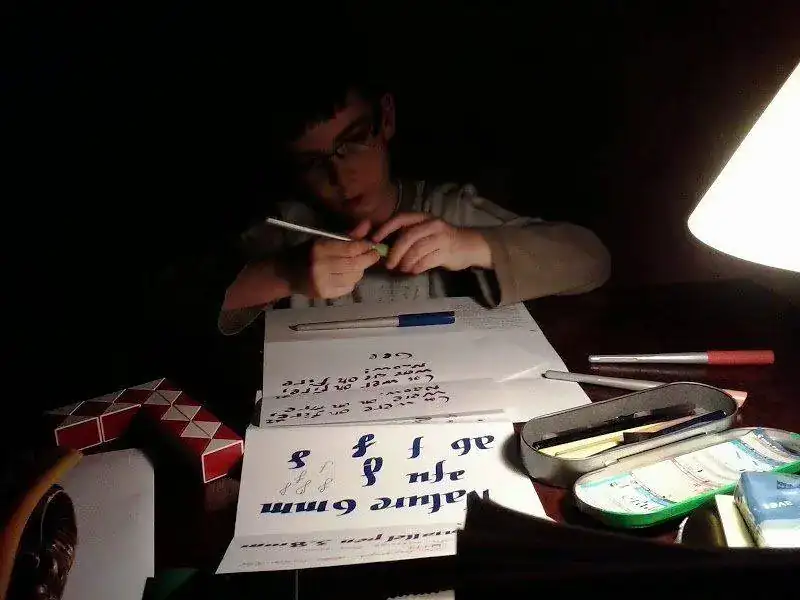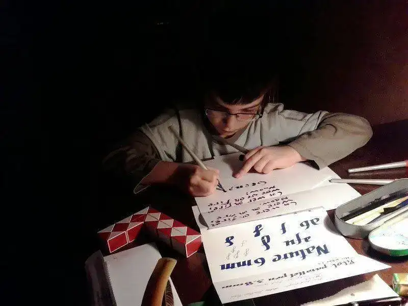 El joven aprendiz de calígrafo se apropia del espacio de trabajo de papá. Las plumas son las populares Pilot Parallel Pen, sus favoritas.