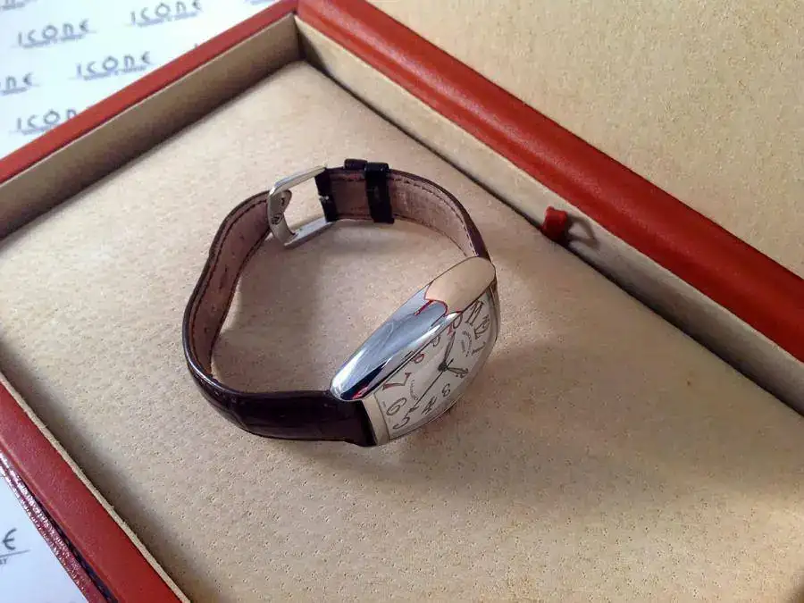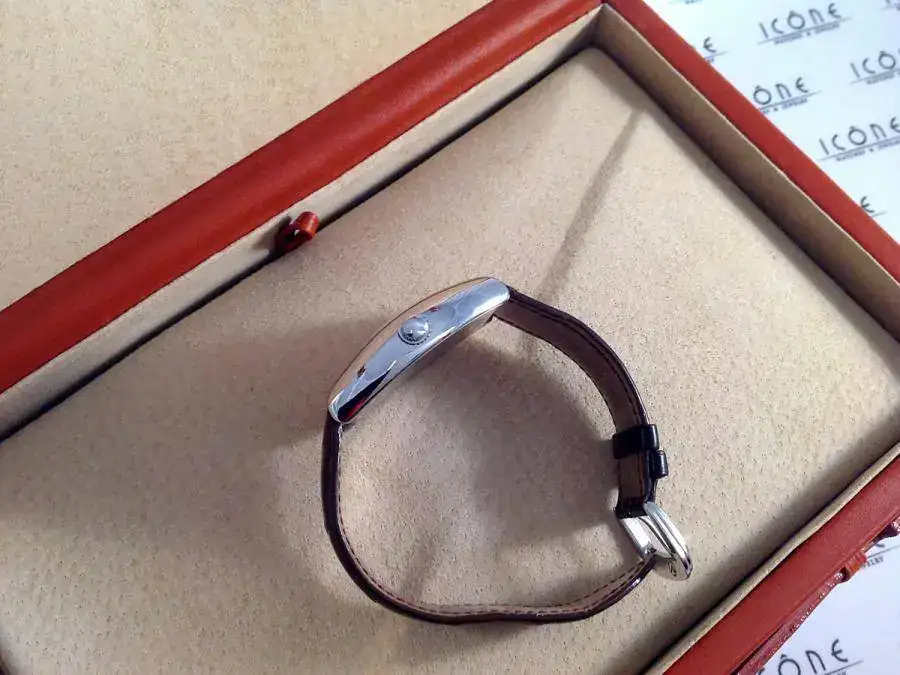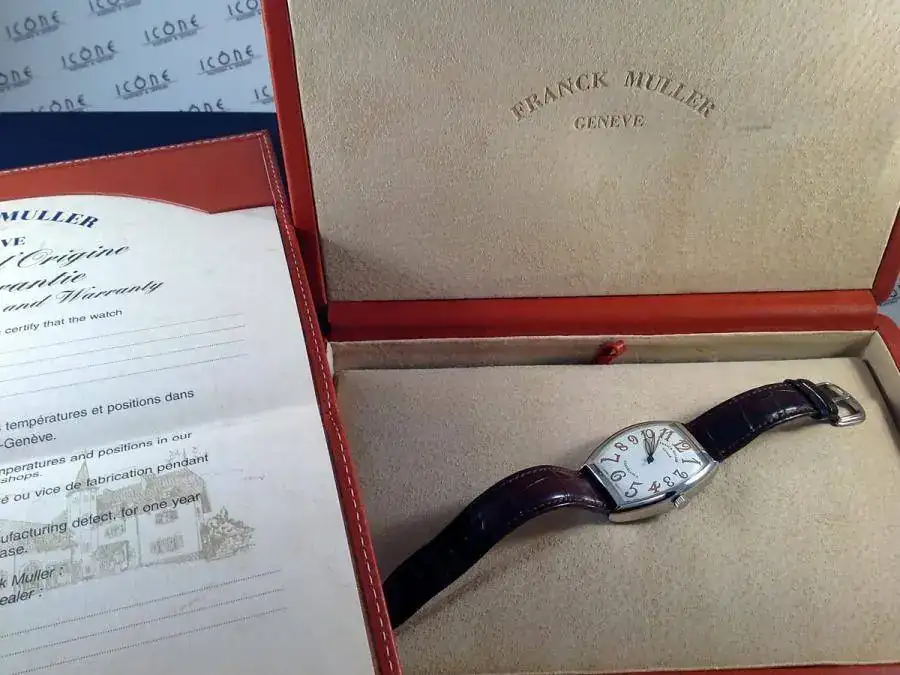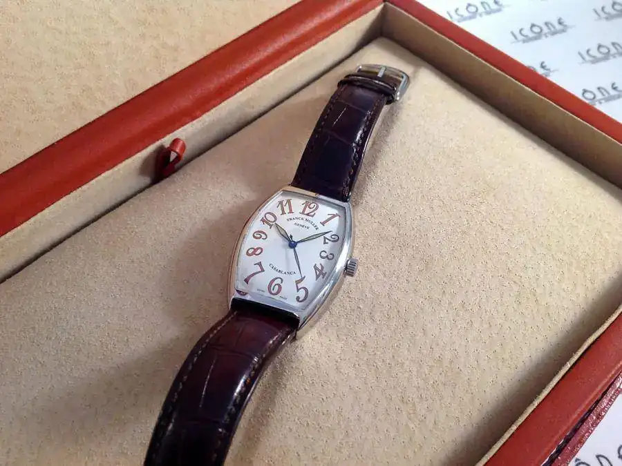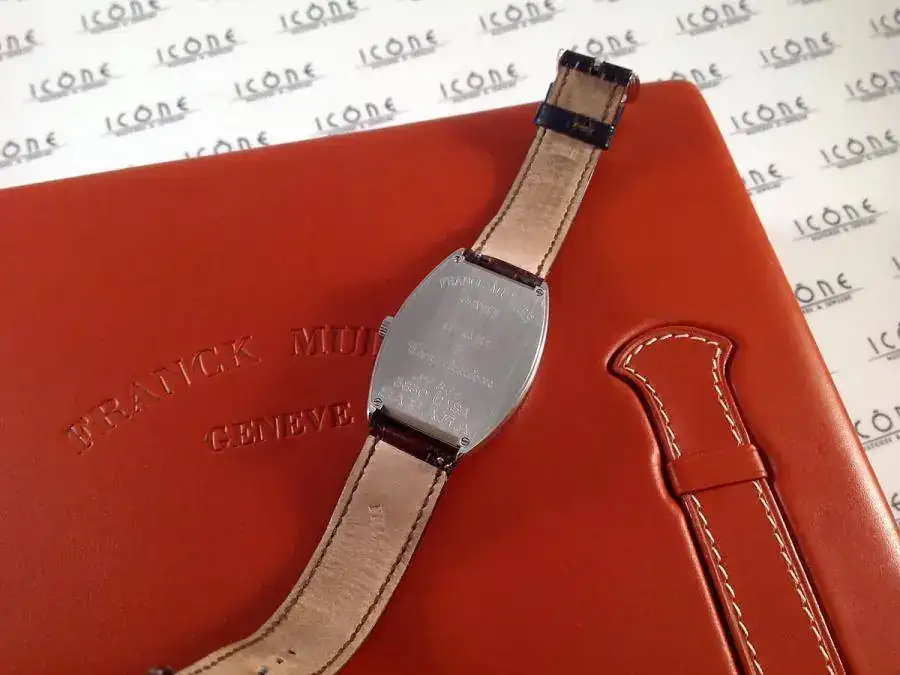 Las características son: Reloj automático con caja de 45x31mm, brazalete de piel de cocodrilo con hebilla Franck Muller, calibre 2800, cristal de zafiro curvado.