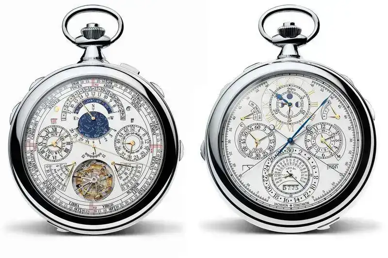 Dicha ostentación, en reloj complicado de bolsillo le corresponde a Vacheron Constantin, con su reloj referencia 57260, que incluye 56 complicaciones en un reloj de bolsillo con caja de oro blanco de 98mm...