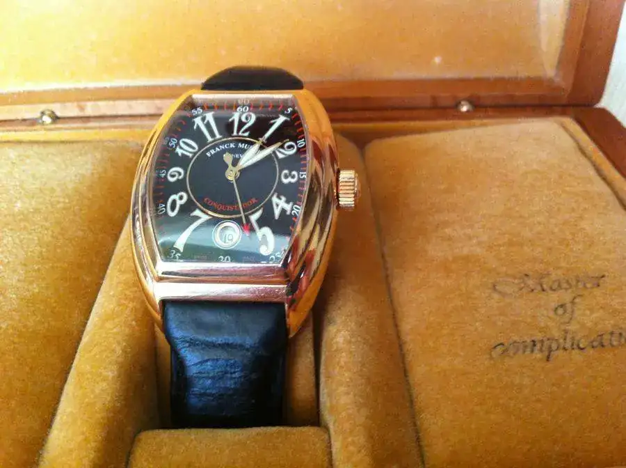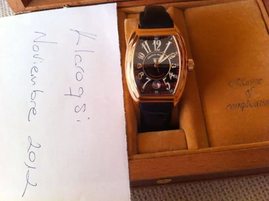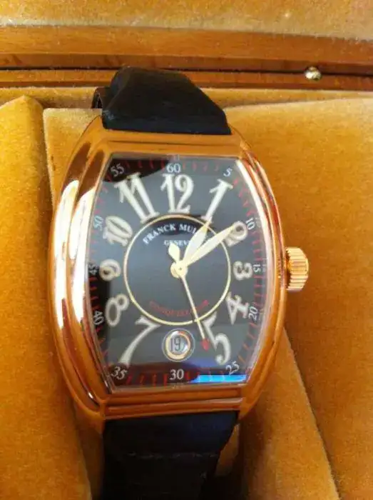 Vendo Frank Muller Conquistador Oro rosa de caballero. Ref. 8005 SC, automático, con esfera negra, correa de cocodrilo, cristal de zafiro, corona a rosca y un diámetro aprox. De 40 mm. Su precio nuevo estaba por encima de los 12.000, creo que su precio de ocasión serían 7.000€. Tiene caja y la documentación no la encuentro, por eso le hago un descuento de 1.000€, es decir, 6.000€. También creo que habría que cambiarle la correa y hacerle una revisión, por lo que descuento otros 1.000 Eurazos. Total, precio final 5.000 €uritos para el primero que llegue.