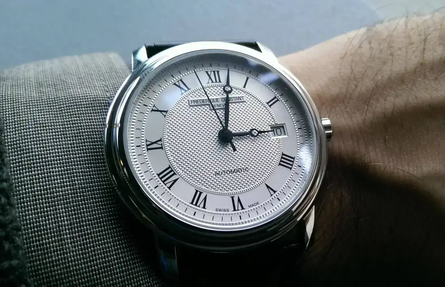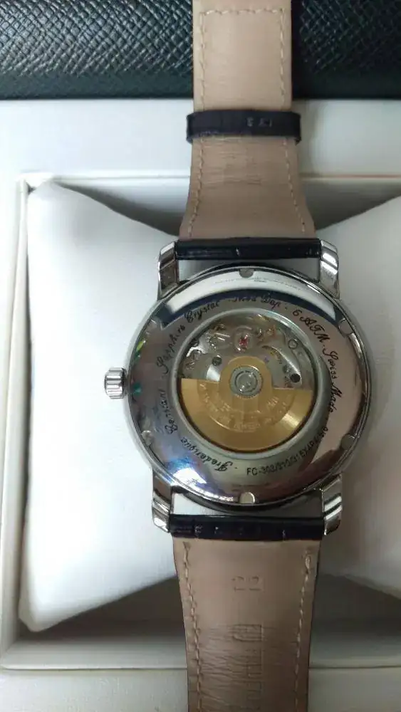 Movimiento: FC-303 automático. 26 rubíes, frecuencia 28'800 v.p.h. y 38h de reserva de marcha.