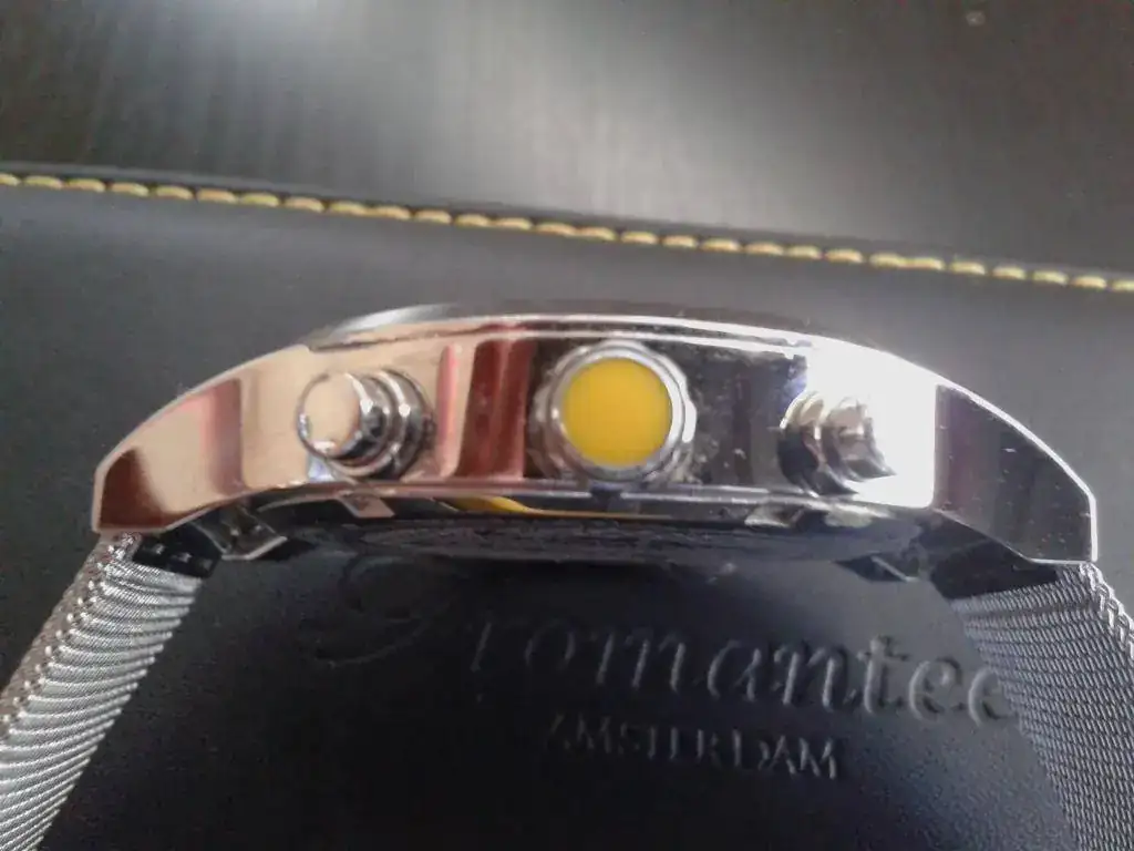 El reloj se encuentra en muy buen estado, sólo destacar un golpe en la asa inferior izquierda, que puesto no se nota y que tienes que fijarte mucho para verlo, le he hecho una foto para que lo podais apreciar en su macrodetalle, al natural se nota muchísimo menos.... Aparte de eso tiene los típicos micropelillos de los acabados a espejo, micropelillos son eso, micropelillos.... nada de arañazos o similares, a las fotos me remito