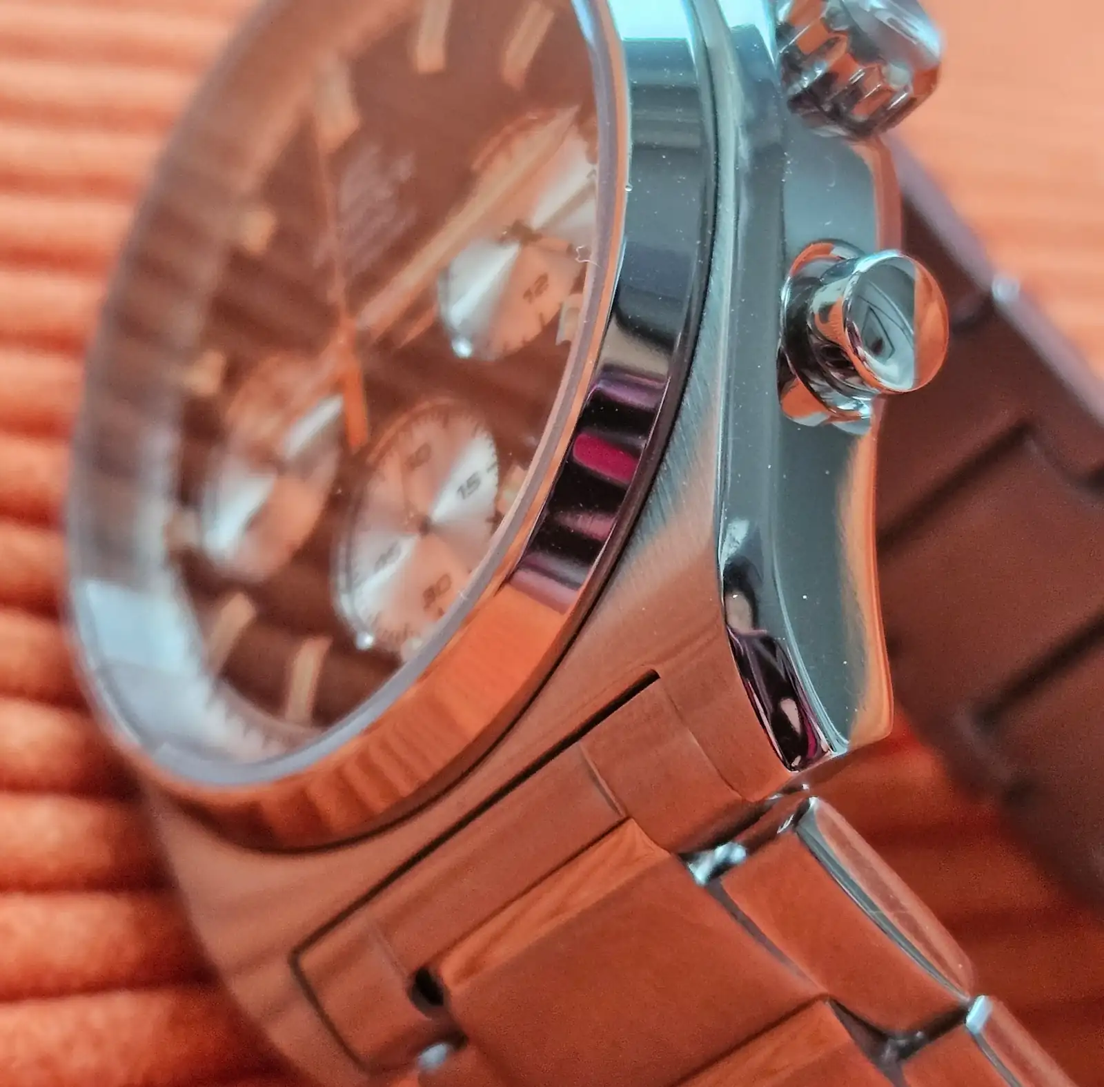 En segundo lugar la altura de caja es ideal gracias a su módulo de cuarzo origen Miyota [error, parece que es Seiko]. Opinión impopular: en asequibles prefiero cuarzo, principalmente porque todos sabemos que en relojes sobre los 100 euros no se les va a hacer servicio nunca y eso lo lleva mejor un cuarzo. Lo malo es el tacto de los pulsadores, que no es mecánico en absoluto y ahí ganaría un mecacuarzo de Seiko (PD: sigo prefiriendo este por la posición de las subesferas)