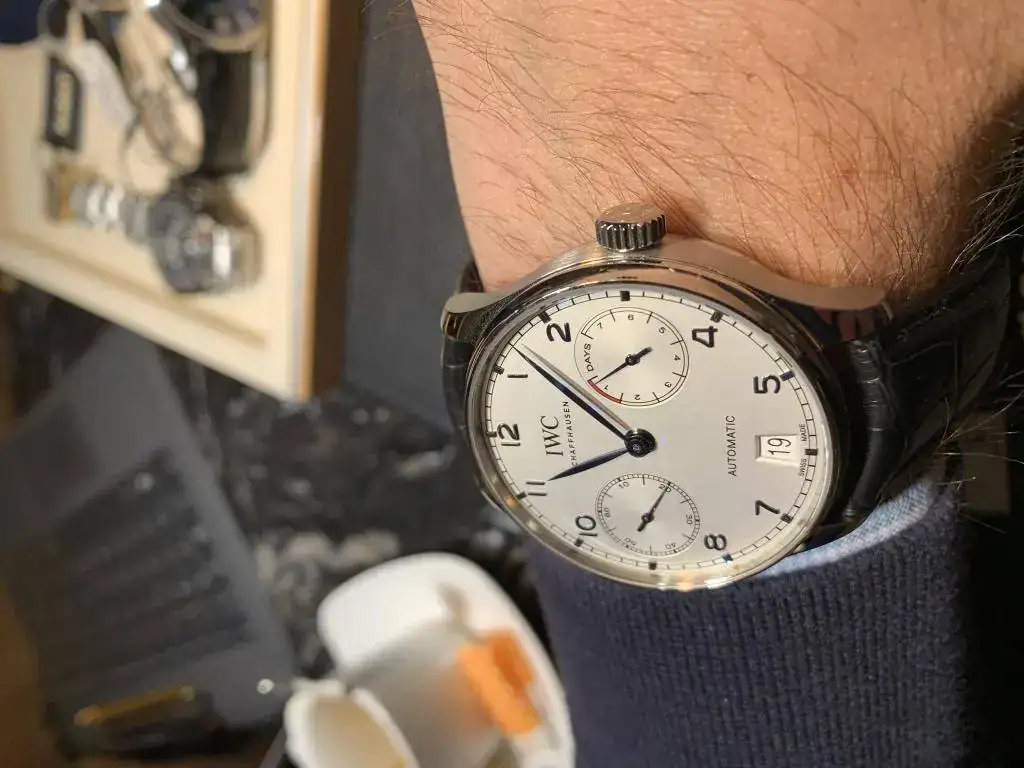 El modelo que quizá más me gustaba a priori, únicamente habiéndolo visto en foto, era el IWC portugieser 7 días. Un reloj muy elegante, impactante visualmente y con un calibre impresionante, y por qué no decirlo, por encima de mi presupuesto inicial. Lo único que no me acabó de convencer fue su grosor, y el color de la esfera y agujas, siendo más oscuro que en las fotos de la web.