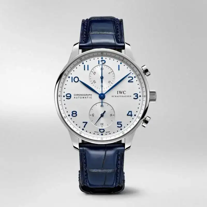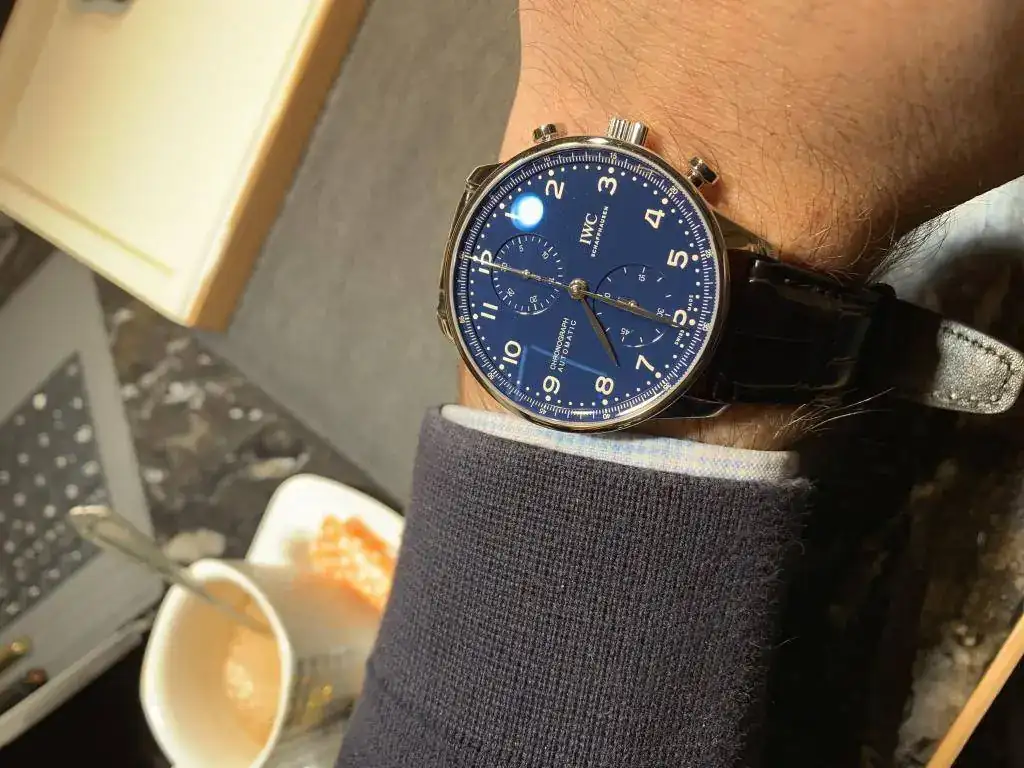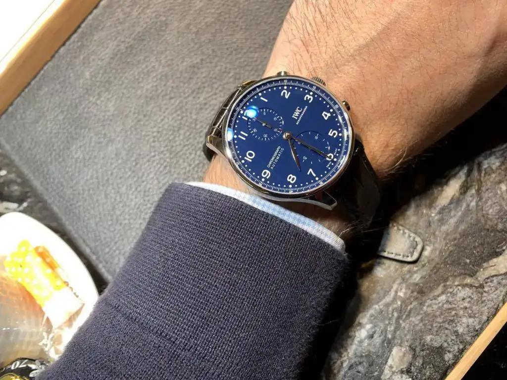 El segundo era también un IWC, en este caso el portugués cronógrafo, referencia IW371446. Solo tenían disponible la versión con el dial azul (el que quería era en blanco con correa azul). Un reloj muy elegante también, de dimensiones más comedidas (la altura del 7 días me pareció importante...), y con un movimiento que nada tiene que ver con el manufactura del 7 días... pero relojazo a fin de cuentas.