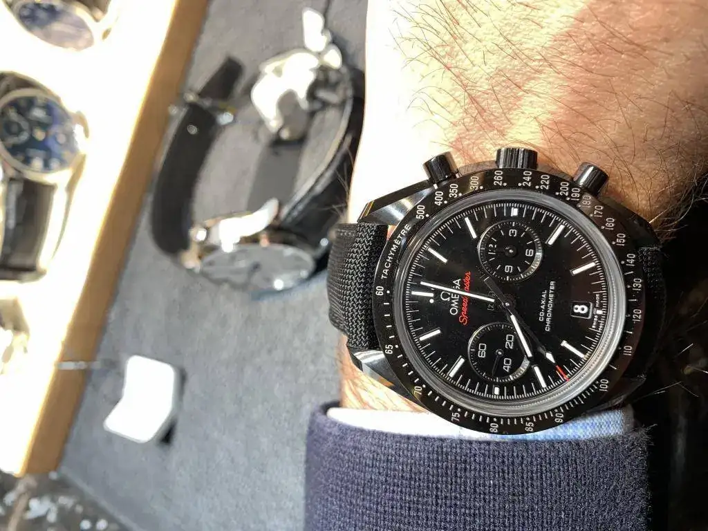 Y por último, solicité que me mostraran el Omega Speedmaster Dark Side of the moon, modelo al que seguí la pista hace unos años cuando lo presentaron. El Speedmaster es un reloj que me tenía cautivado desde hacía años. En anteriores ocasiones me había probado el Speedy moonwatch, de 42 mm. El clásico vamos, otra preciosidad.