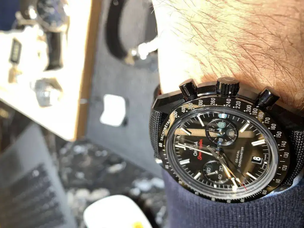 Pero al colocarme sobre la muñeca el Dark Side, sentí algo que no había sentido antes con los demás relojes que me había probado... incluso teniendo a escasos centímetros los espectaculares IWC anteriores, solo tenía ojos para el Omega. Os pongo unas fotos del momento