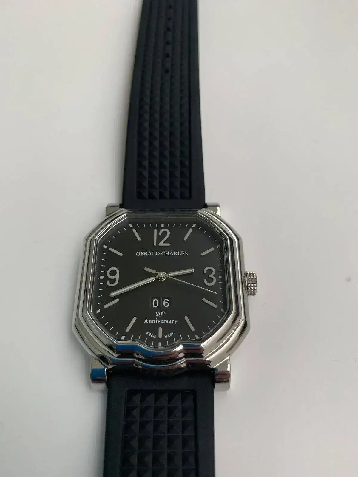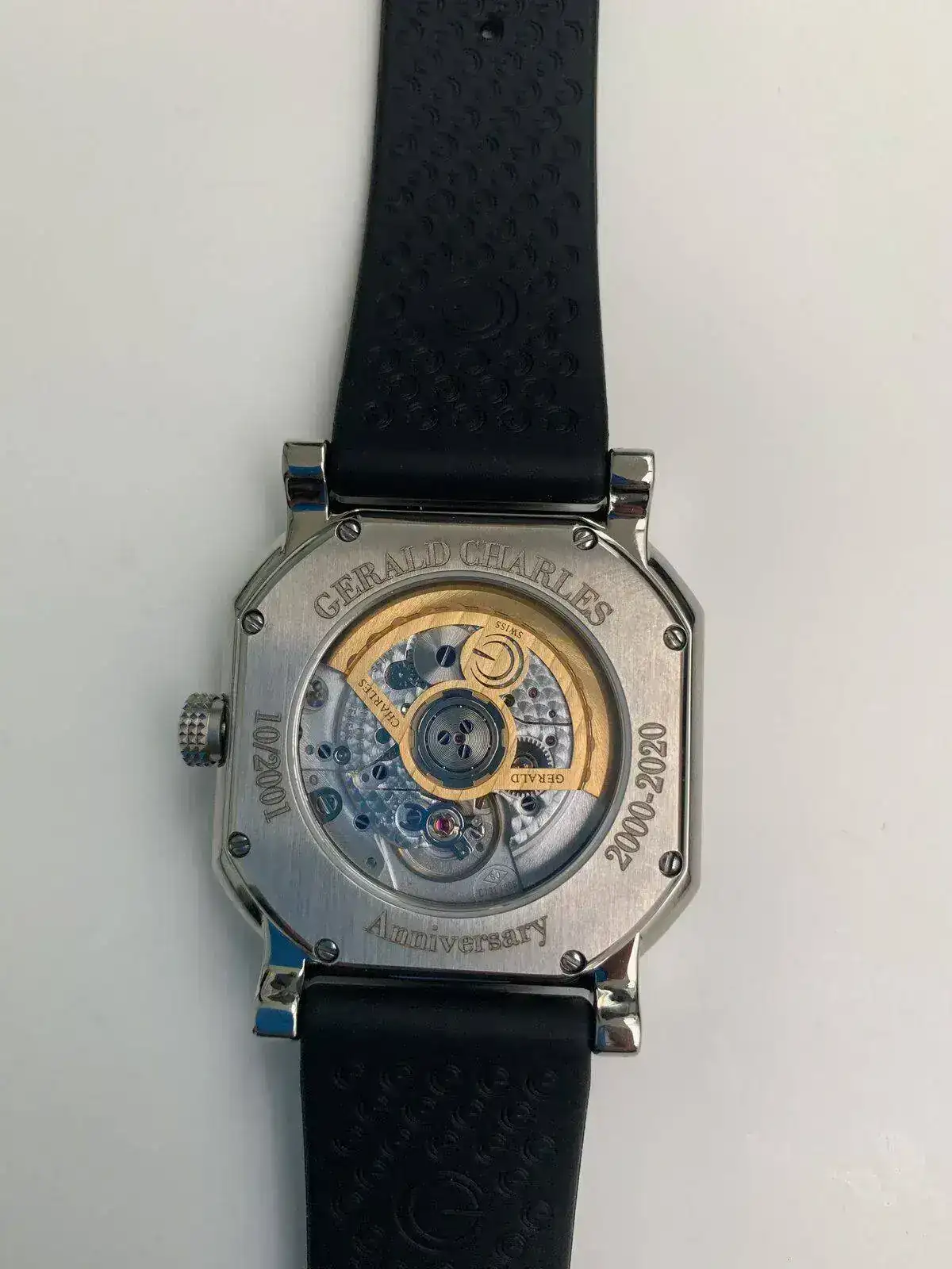 Me enseñó este reloj en Septiembre del año pasado un buen amigo propietario de relojería en Madrid y, de inicio, simplemente viéndolo sinceramente no me interesó. Después me fue contando el relato de la marca, que se habían dirigido a ellos en España para poder ser su distribuidor oficial y les habían dejado esa pieza como muestra para enseñarla. Tomé toda la información que pude, incluido su “moderado” precio pvp por debajo de las 5 cifras, y me dediqué días después a corroborarla en Internet. Y en efecto todo lo que me habían indicado era cierto. Además, como añadido, resultó que estaba en el mercado de segunda mano bien revalorizado. También destacar que era lógico pensar que en España era muy difícil encontrarte con alguien con ese modelo, por no decir casi imposible, y por tanto su exclusividad también estaba fuera de toda duda. Y finalmente en la web de la marca ya aparecían todas las 252 piezas como vendidas. Así que estaba casi convencido de que era una pieza a tener muy en cuenta para una posible futura compra, a pesar que era la primera vez en mi vida que escuchaba el nombre de la marca (y siendo Suiza para mí eso era extraño). No una obsesión, como otros han podido ser, pero sí una seria posibilidad para recubrir huecos especiales en la colección. En Navidad fui de nuevo a la relojería por otro asunto con mi socio que quería cambiar la pila de un reloj suyo y pregunté si ese Gerald Charles lo tenían vendido. Me dijeron que sí, que lo habían vendido pero que les había llegado otro a raíz de la venta y que la marca les dijo ya no tenían más. Al enseñármelo esta vez ya sí me fijé en la trasera en el número de reloj dentro de esa edición limitada de 252 y, en efecto estaban numerados del 1 al 12 (cada uno correspondiente a un mes) y del año 2000 al 2020. Ese en específico era el 10-2001. Mi socio se quedó pasmado y dijo que ese era exactamente el mes y el año en el que yo me incorporé a trabajar en la empresa con él (sigo en ella). Yo ni me acordaba sinceramente, pero él sí y tenía razón. Así que viendo todas las ventajas que me ofrecía el reloj (historia del fundador, casualidades personales con el número, novedad para mí en la marca, precio, revalorización real, y que era Navidad y al haber ya vendido uno previamente me podían incluso hacer un mejor descuento) lo compré y salí con él de allí puesto. Y no sé por qué pero ahora mismo me encanta. Desde luego, sin duda, me gusta mucho más que la primera vez que lo vi. Y supongo eso es lo más importante cuándo adquieres un reloj.