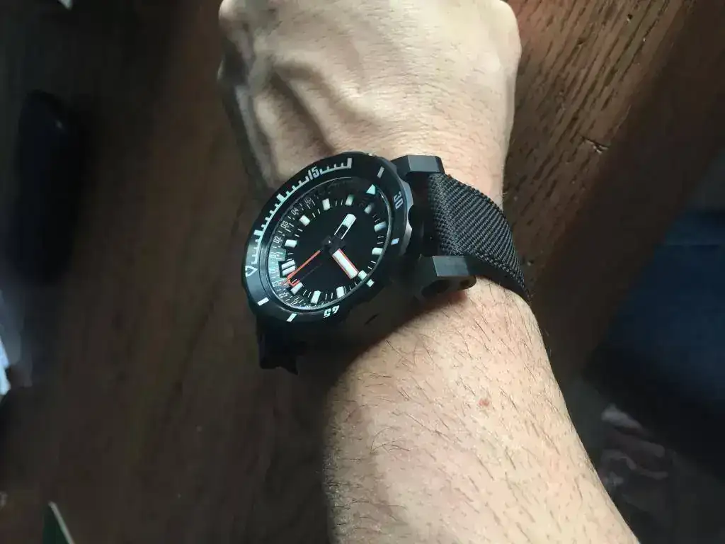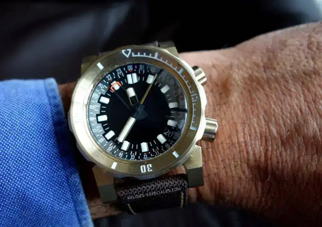 Iba a decírselo por privado al trío calavera (Jaime, Jesús, Toni), pero quiero que lo sepa todo el mundo: Sois unos p cracks diseñando. A pesar del tamaño, la altura, las dos -grandes- coronas... a pesar de tenerlo todo en contra, el Galerna es comodísimo de llevar. Se asienta perfectamente en muñeca, no pesa (al menos lo que esperarías que pesara viéndolo) las coronas están perfectamente situadas para que no molesten ni se claven (nada de nada) en la frontera muñeca-mano... Incluso el hueco correa-caja queda bien. Y lo mejor: puedo consultar la hora sin "las gafas del serca"
