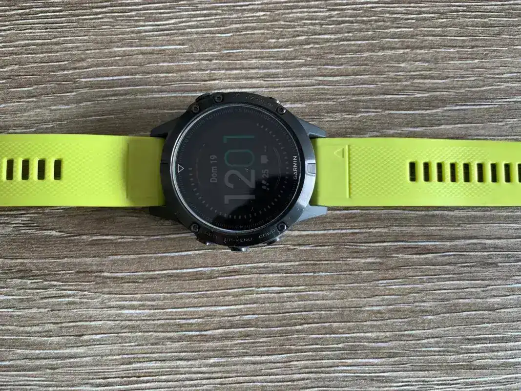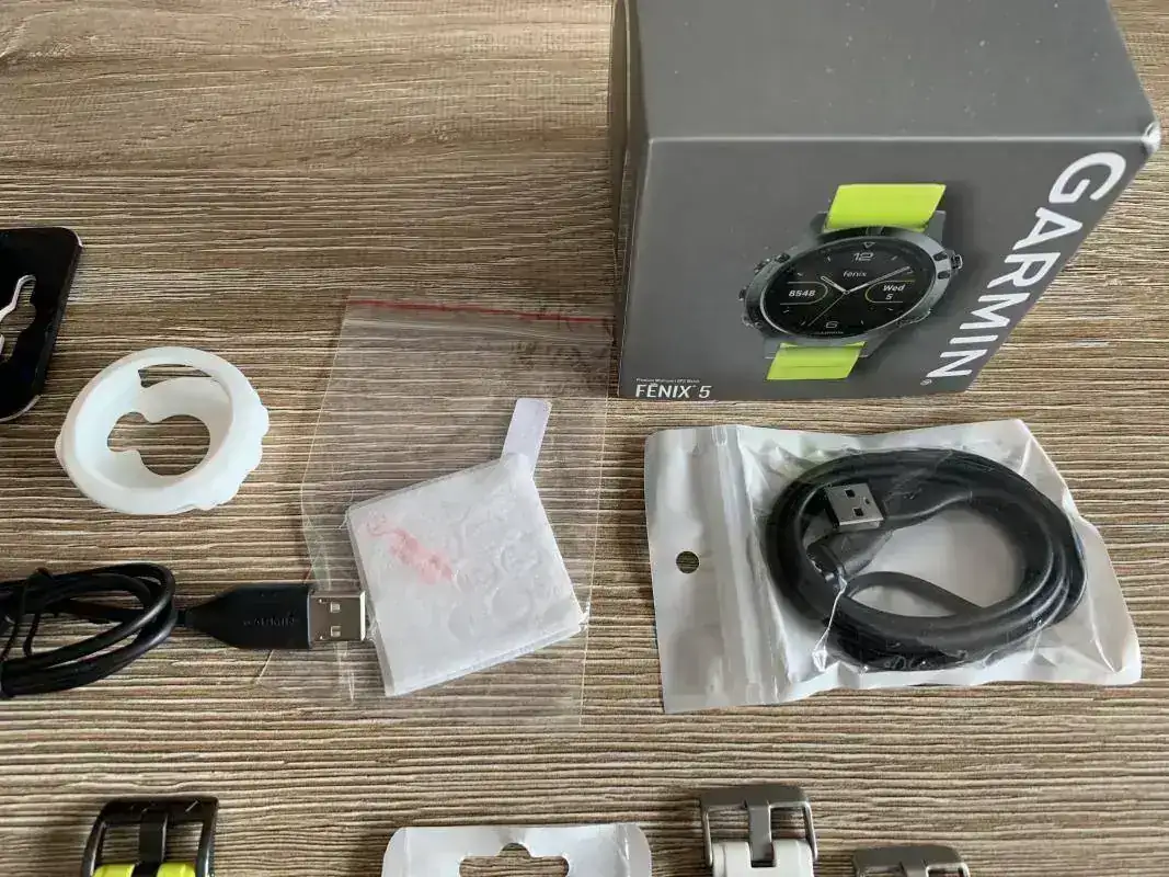 - Caja con el Garmin con pulsera original amarilla claro, instrucciones y cable de carga