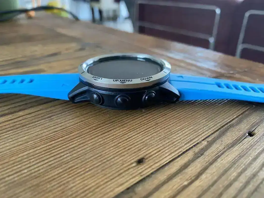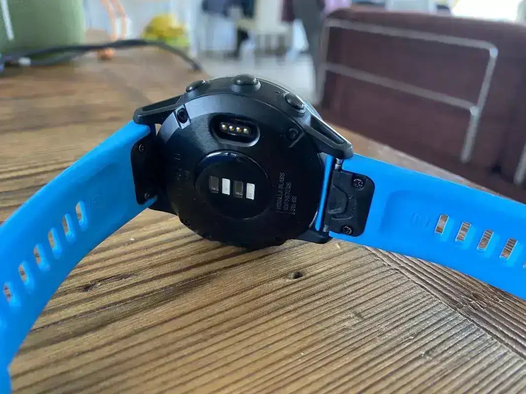 La correa azul de la foto no se entrega (pertenece al Quatix). Viene con una negra (adjunto foto de internet con ella) y regalaría otra naranja.