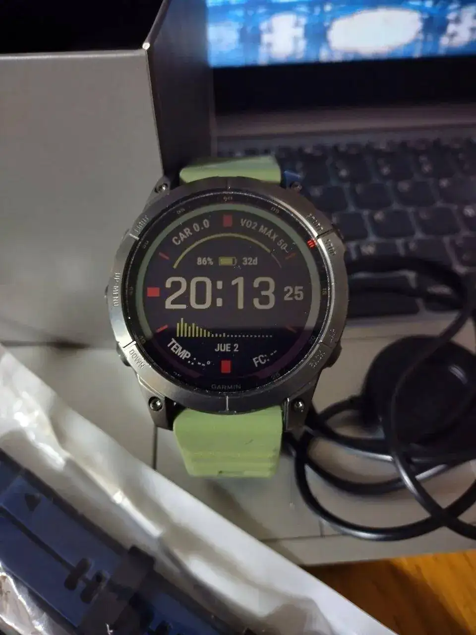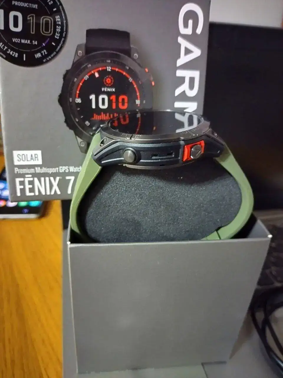 Tiene su caja, correa original + 2 correas mas sin usar verde y negra.