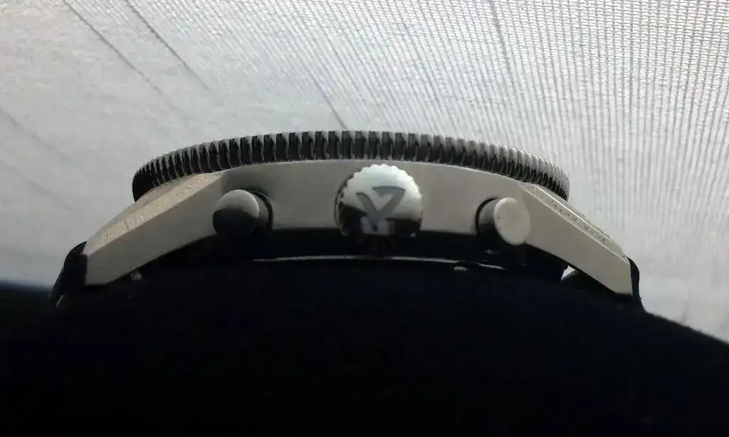 - Crono (pulsadores sin roscar) con un tacto muy suave, cepillados junto con pulidos, se nota que es de calidad ... la trotadora parece de un mecánico/automático, pues oscila casi con continuidad...no a saltos