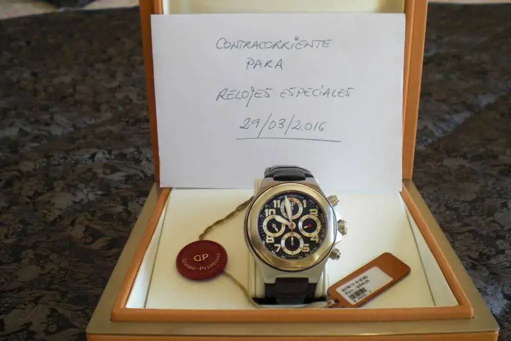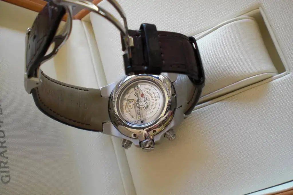 El Laureato Evo3 es sobradamente conocido. Su calibre es manufactura propia de GP, modelo 033 CO, con el rotor en oro. Es la Refª. 80180, de 52 rubíes y con 28.800 alternancias/h. La reserva de marcha aproximada es de 46 h.