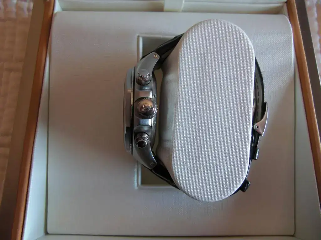 Tiene muy pocas puestas al haberse rotado con otros distintos relojes y en los tres úlltimos años solamente se ha mantenido en marcha cada 2 semanas, limpiado y guardado en su estuche. Tiene por su escaso uso alguna microrraya y marquita, prácticamente imperceptibles. Creo que las fotos hablan por sí mismas del estupendo estado del reloj.