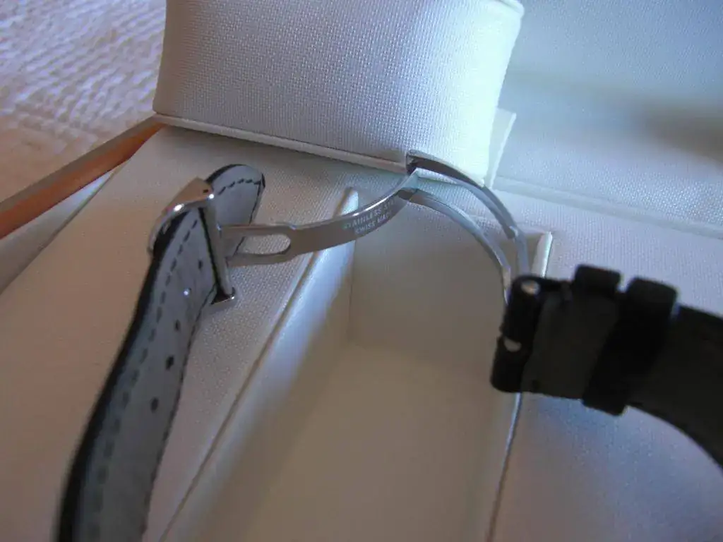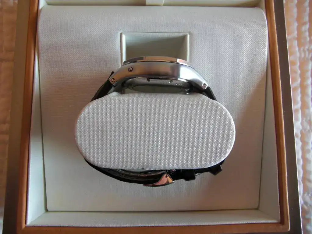 Caja de acero de 44 mm. de diámetro y 15,10 mm. de espesor, con dorso de cristal que permite la exposición de la maquinaria. Lleva correa de piel de cocodrilo marrón original y cierre desplegable también original.