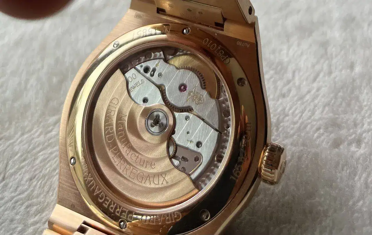 El calibre es el GP01800 manufactura de la casa y con unos acabados a mano preciosos de granulado circular en la platina, biseles pulidos a espejo y côtes de Genève en los puentes y en el fantástico rotor de oro rosa. Tiene 54 horas de reserva de marcha y 50 metros de estanqueidad. Lo justo por si te caes a la piscina ó al mar, aunque no creo que el que lo lleve puesto esté pensando precisamente en hacer un curso de buceo con semejante pieza.