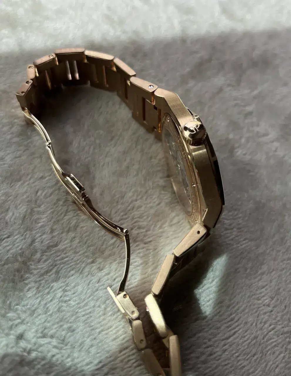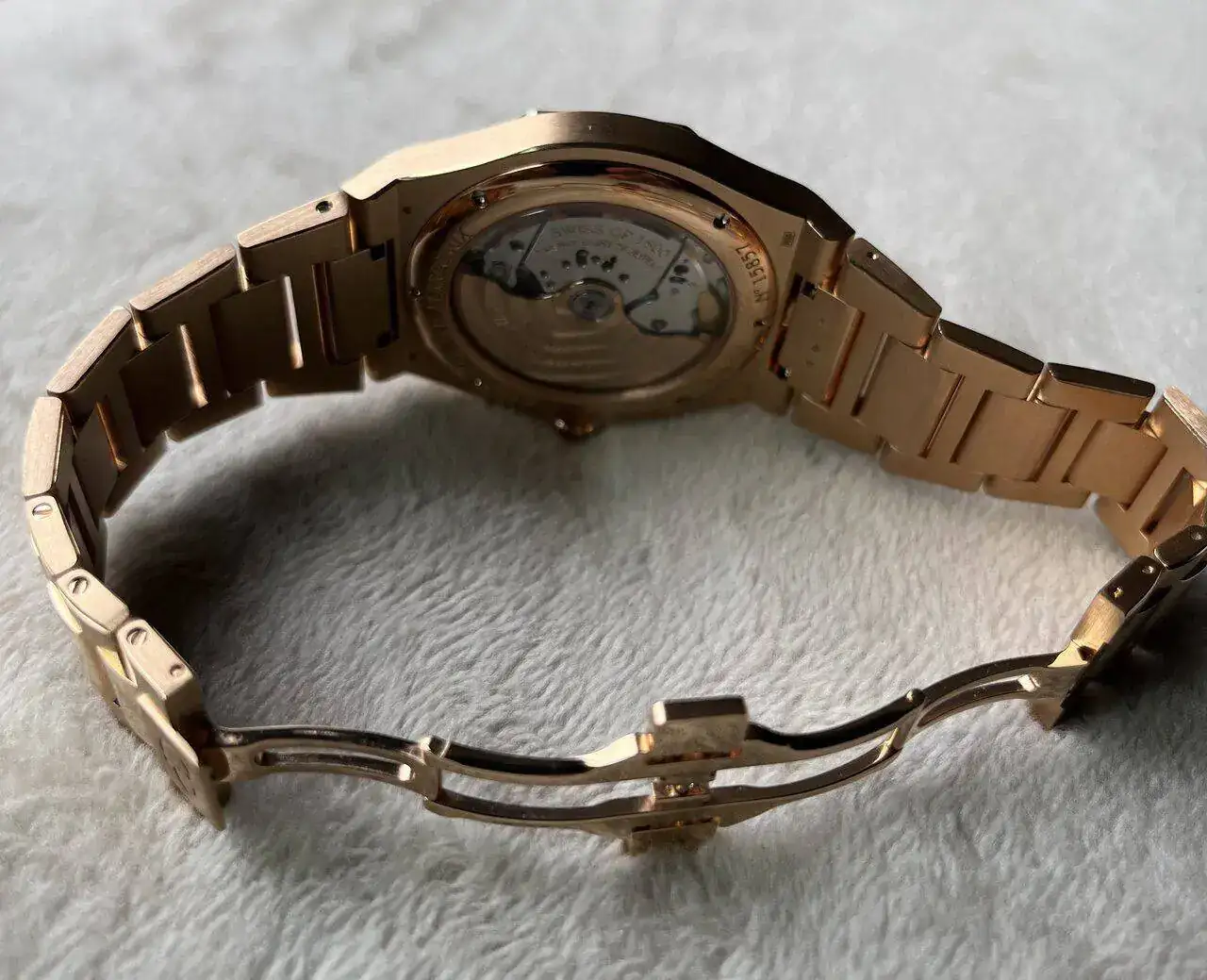 La caja es, cómo no, de oro rosa de 18 kilates alternando superficies pulidas con satinadas, con las formas y bisel típico octogonal de la colección Laureato. Un icono contemporáneo de reloj deportivo como son el RO ó el Nautilus. Sus dimensiones son de 42mm de diámetro por 10,68mm de altura, cumpliendo estéticamente las medidas teóricas de belleza horológica 4:1. Aunque por sus dimensiones de diámetro pudiera parecer grande yo mismo he llevado durante muchos años esas mismas medidas en el Laureato crono panda y en ningún caso me he sentido incómodo como con otros relojes de similar diámetro. Está perfectamente equilibrado en ese sentido. Aparte, que siendo sinceros, el hecho de ser algo grande a este modelo le beneficia. Digamos que el reloj está hecho para atraer la atención de cualquiera y por tanto si es grande se luce todavía más. Es una pieza que obviamente tiene garantizadas muchas temporadas en la caja del banco, pero que en las pocas ocasiones que pueda salir al exterior seguro es un auténtico escándalo. Y esa admiración que su visión genera está también muy relacionada con el tamaño. Un reloj más pequeño no lograría atraer tanto la atención, y este reloj se ha fabricado con ese propósito de forma clara. Así que creo el tamaño es el correcto para esa tarea.
