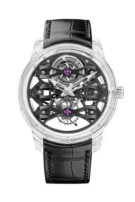 El Quasar es el resultado de la aplicación natural de cuatro principios del universo Girard-Perregaux El primero es la patente de 1884 que corona la creación de tres puentes de oro visibles por el lado de la esfera, firma única de la Maison. El segundo es el esqueletizado, finamente realizado a mano en los talleres de la Chaux-de-Fonds. El tercero es el nacimiento en 2015 del Neo-Tourbillon con Tres Puentes. En este modelo los puentes no eran ni rectos ni de oro, sino arqueados, esqueletizados y negros. El cuarto es el uso del zafiro con una función más técnica que la de un simple cristal. Con el Laureato con Tres Puentes de Zafiro de 2007 se adoptó el cristal de corindón para la estructura misma de un calibre de alta relojería. Estos cuatro vectores convergen para dar vida al Quasar.