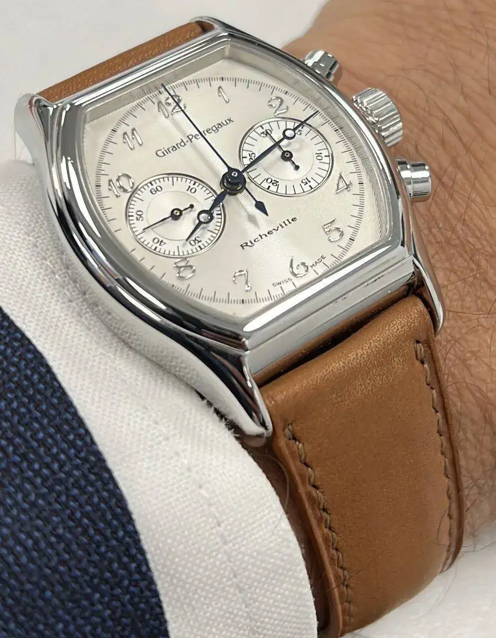 El Richeville en formato tonneau y pulsadores redondos (mucho más adecuados que los ovalados que llevan otras versiones) es un crono de una elegancia que habla por sí sola. Y además no te encontrarás con ningún otro prácticamente nunca.