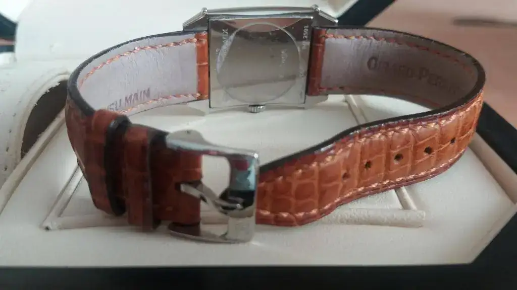 Correa nueva pero tiene la forma de haber estado guardada en el estuche.