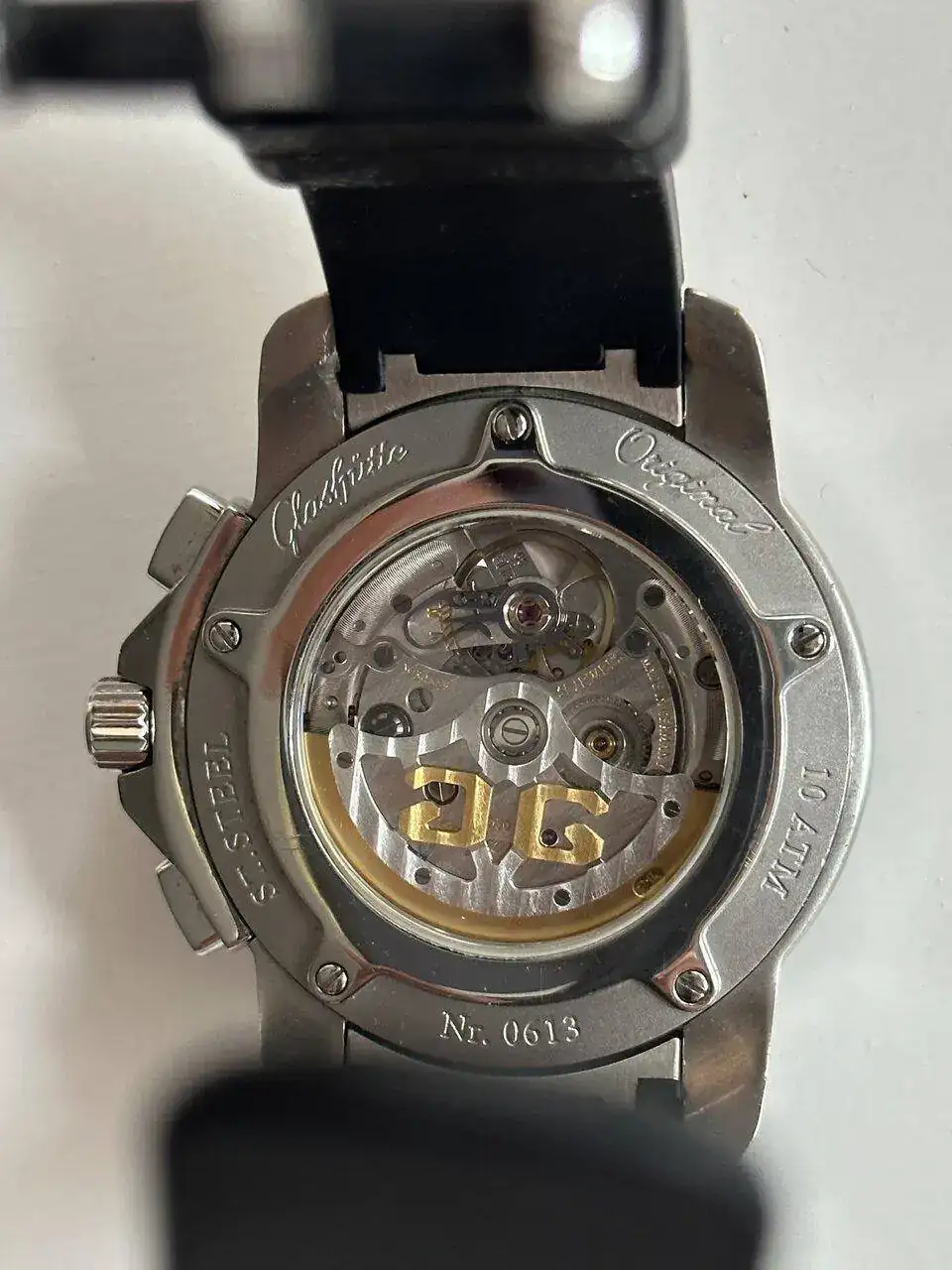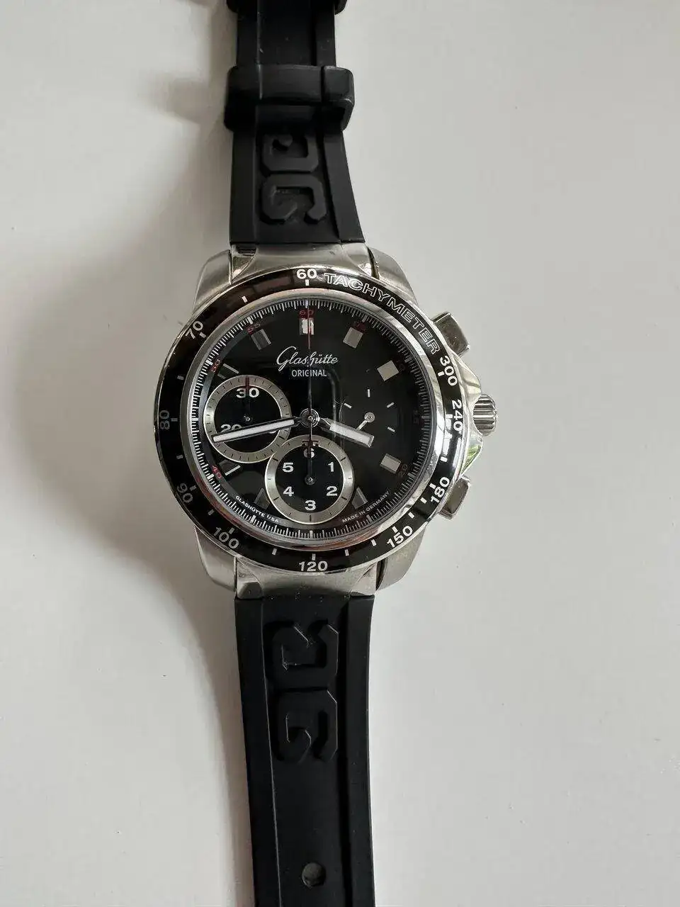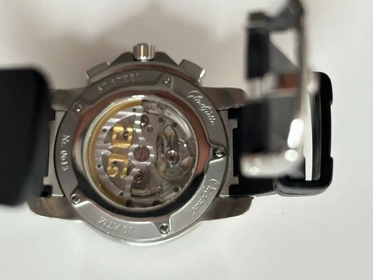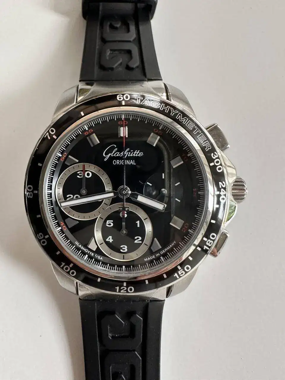 Es un Glashütte Evolution Chrono de 42 mm. Con correa de caucho.