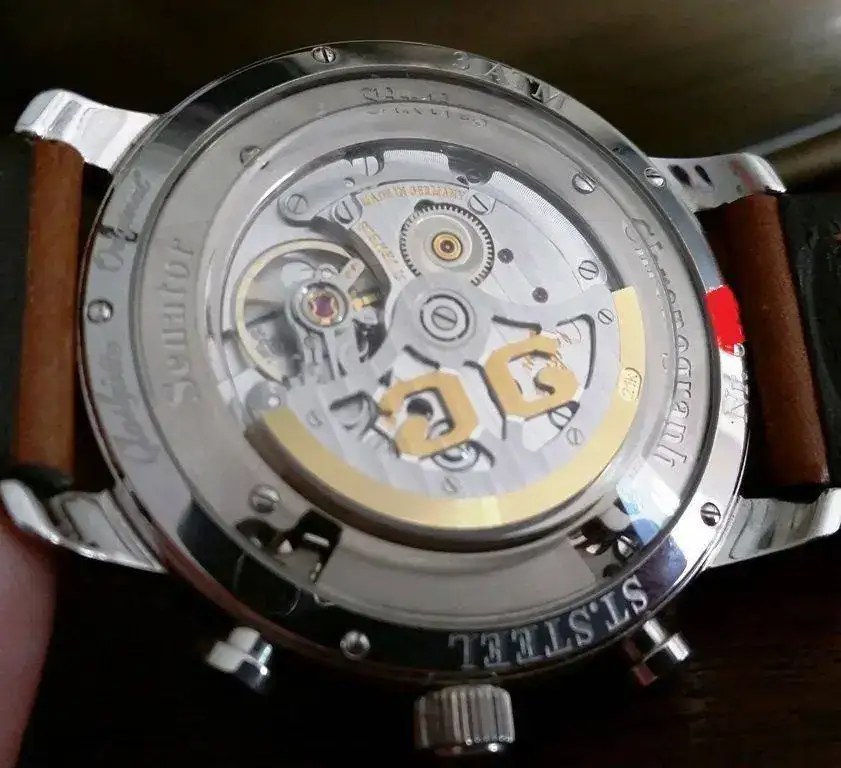 Se trata de un Glashutte crono con movimiento automático (51 rubíes) 28.800 A/h, 40 h de reserva de marcha, espiral plana, masa oscilante en oro de 21K, cuello de cisne para ajuste fino etc...vamos una auténtica manufactura!!!!