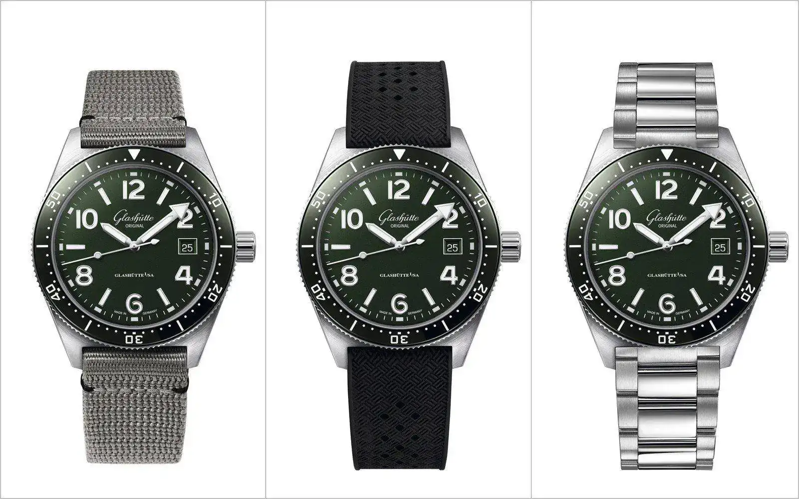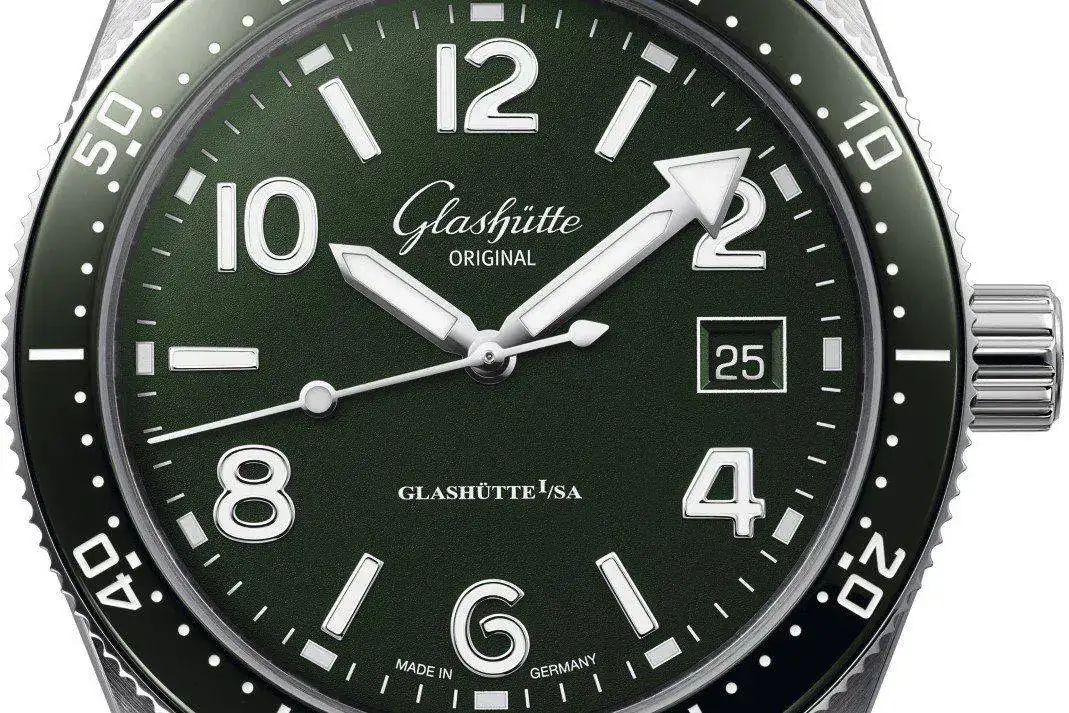 El ya no tan nuevo Glashütte Original Sea Q en acero se presenta ahora con esfera de color ¡verde! y tres opciones de correa: tejido, caucho y brazalete de acero. Descendiente del Spezimatic Type RP TS 200 de 1969, el Sea Q cumple con las normas DIN 8306 e ISO 6425 aplicables a relojes de buceo y aporta la sofisticación de su movimiento automático de desarrollo interno 39-11 y un bisel unidireccional de cerámica. Aunque 200 metros de resistencia al agual parecería un tanto justo para un reloj de buceo, son suficientes para pasar la homologación. La visibilidad está garantizada por los grandes índices y agujas recubiertas de SuperLuminova.