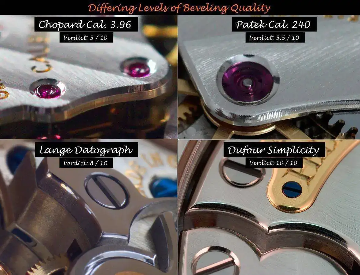 El forero en cuestión compara los acabados de cuatro calibres: un Chopard, un Patek Philippe, un A. Lange & Söhne y un Philippe Dufour. Para el que no lo sepa, Philippe Dufour está considerado, en el mundo de la relojería, como el maestro capaz de realizar las mejores terminaciones del mundo. Esto no es solo una opinión personal, la mayoría de los grandes relojeros, así lo suelen reconocer. Pero para no irme por las ramas, el forero que hace el montaje de las cuatro fotos, otorga una puntuación - según su propio criterio - a la terminación de cada uno de los calibres. No voy a entrar a valorar numéricamente la calidad de esos acabados, pero sí que coincido en que los del Chopard y los del Patek Philippe son parecidos, con los bordes marcados ligeramente por el mecanizado. Detalles, debo insistir, que no se ven a simple vista. En el A. Lange & Söhne se aprecia una notable mejoría frente a los otros dos, mientras que el de Philippe Dufour es perfecto, con un pulido a espejo de los bordes que se ha convertido en la referencia para otros relojeros. Pero el maestro Dufour no se conforma con eso, sino que añade, a modo ornamental, picos y curvas en los biseles que dificultan extremadamente su pulido, y sin embargo, no afectan a la calidad de su acabado.